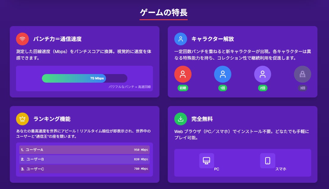 「Wi-Fiパンチ」は、プレイヤーが“パンチングマシーン”を殴ると同時に端末の Wi-Fi 回線速度を測定し、その数値を“パンチ力”としてスコア化するユニークなゲームです。強いパンチ(高速回線)でランキング上位を狙えるほか、プレイ回数に応じて新キャラクターが解放されるコレクション要素も搭載しています。