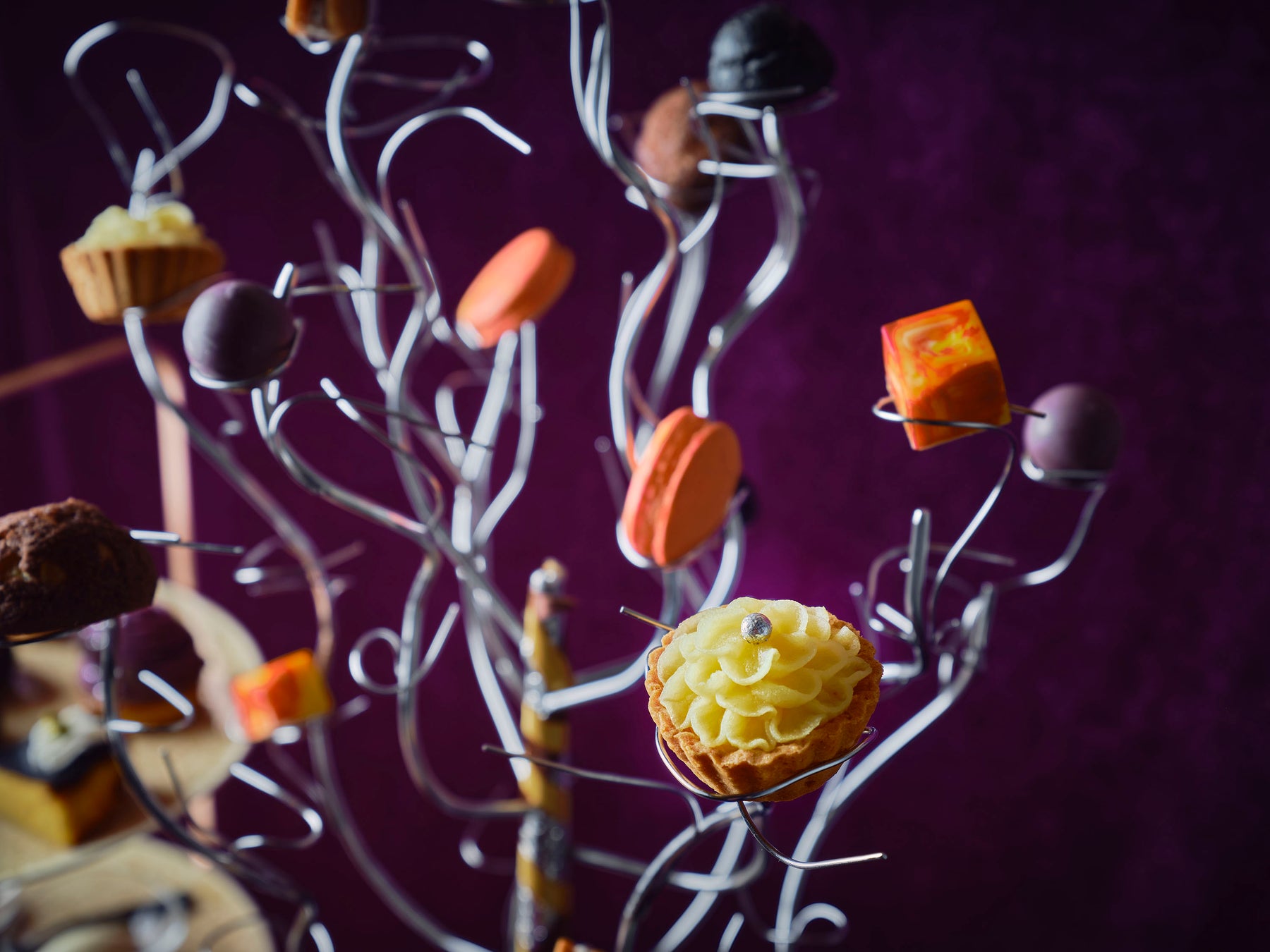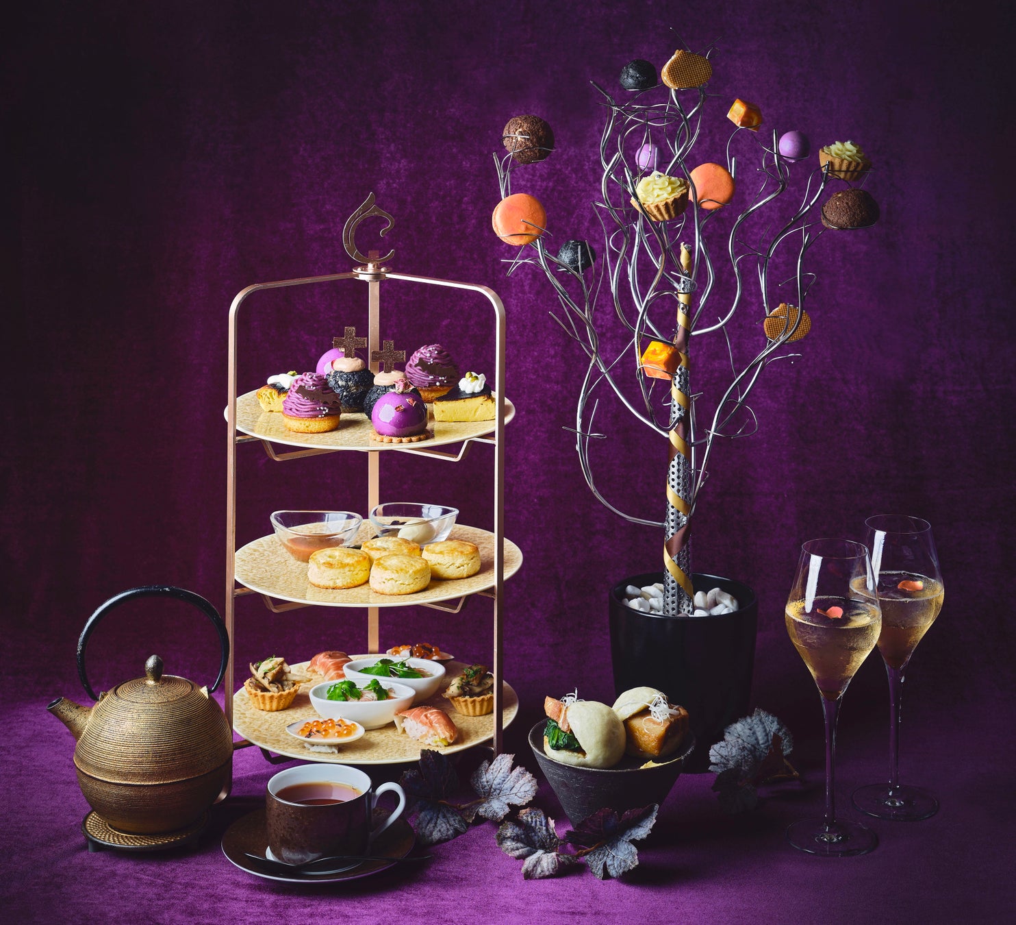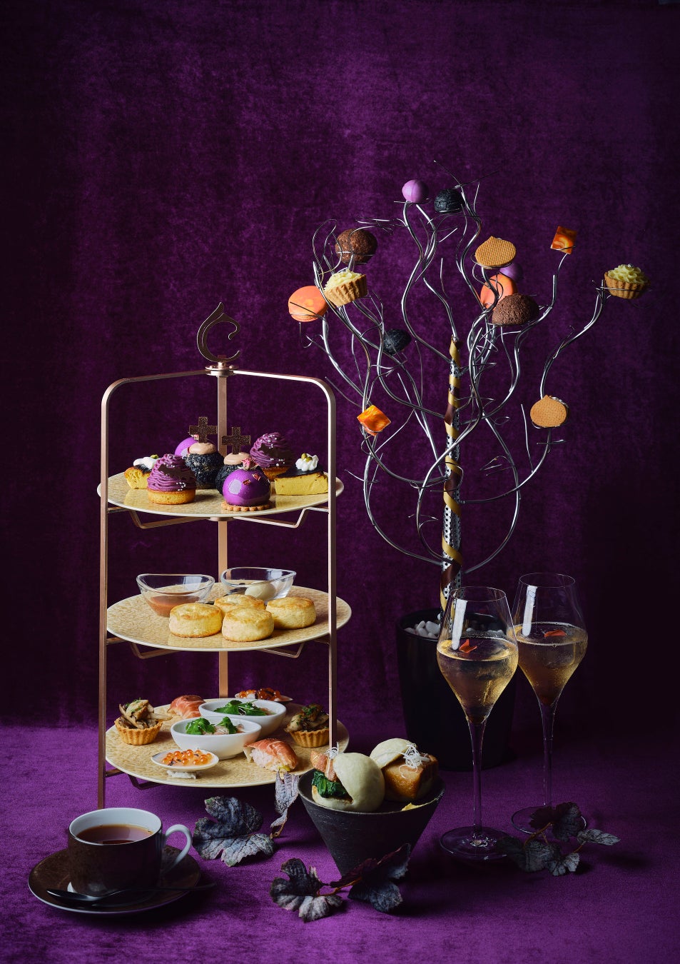 3段スタンドの上段には「大人のハロウィン」をイメージしたシックな色合いのスイーツが登場。ハロウィンで紫色は“夜の光”や“魔法の神秘的な世界”を意味すると言われています。そんな世界観を反映したパティシエ特製のスイーツは、ブルーベリーのジュレを閉じ込めてドーム状に仕上げた栗のムースを紫芋のグラサージュで包み、月や星が美しく輝く夜空をイメージした「マロンムース」や、鮮やかな紫芋のモンブランクリームを夜空に見立て、チョコレートのコウモリを飛ばせた「紫芋のモンブラン」、サクサクのクッキー生地にチョコレートクリームをたっぷり詰め込み、上に乗せたベリーソースと十字架が印象的な「ブラックシュー」、そしてチーズの豊かな味わいとかぼちゃ本来の甘味を感じる「パンプキンのバスクチーズケーキ」の4種類をご用意しました。