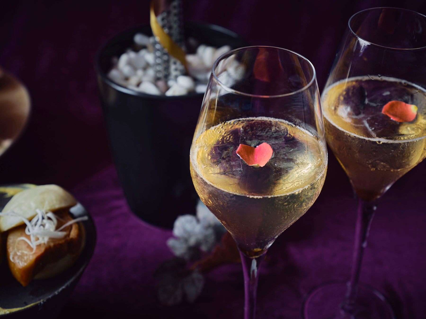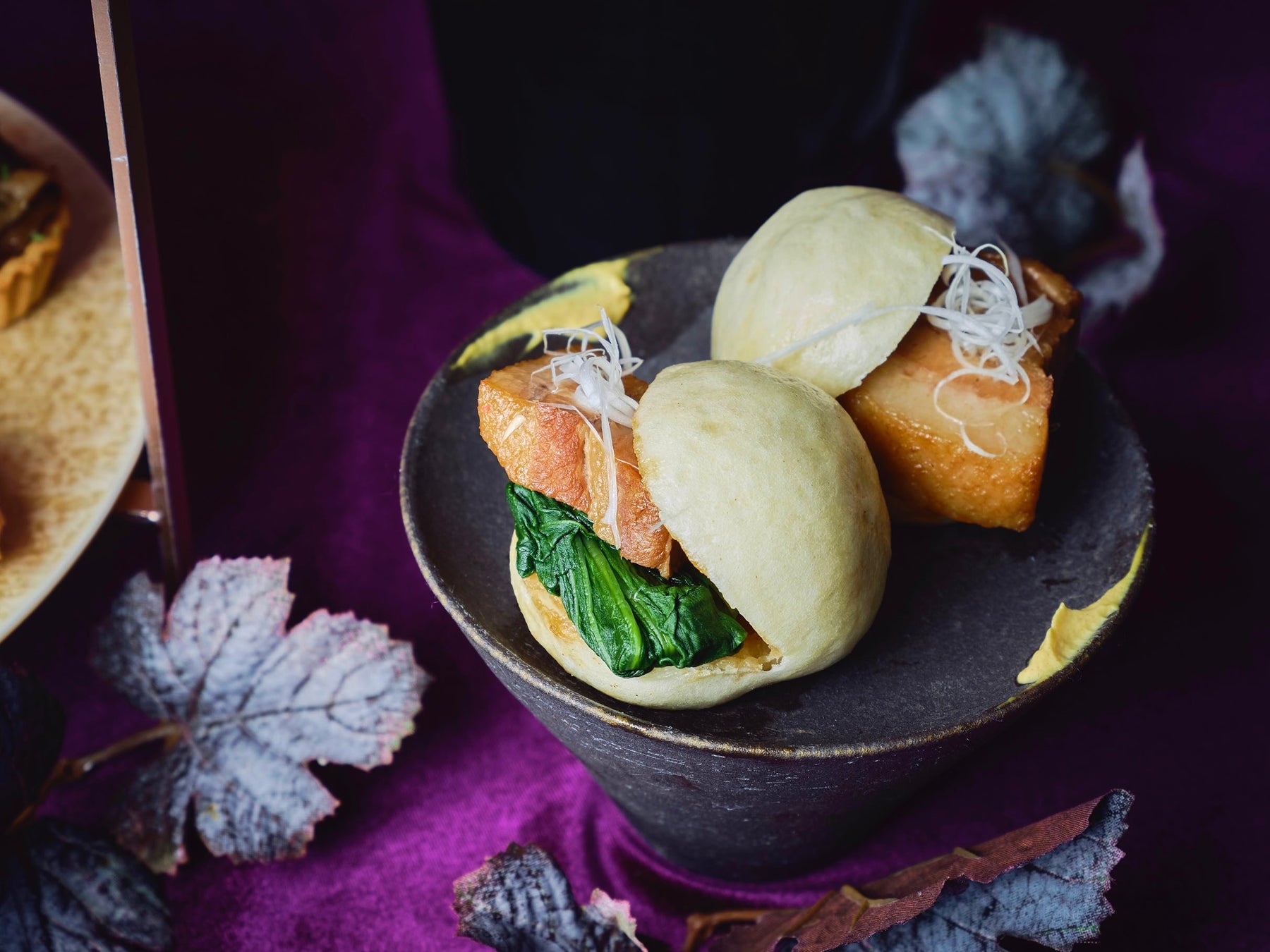 下段には、フランス料理のシェフが考案した本格的な味わいが魅力のセイヴォリー4種類をご用意しました。いくらと海鮮をトマトのジュレと合わせ、はまぐりの貝を器にした「魚介のピクルス」や、みょうがのペーストを塗り軽く燻製させた味わい深い「スモークサーモン」、キヌアを詰め込んだタルトにきのこのソテーをたっぷりトッピングした「きのこのタルト」や、赤ワインビネガー・バルサミコ酢・ブラックペッパーで味付けし、細かく刻んだ銀杏を混ぜたユニークなすし飯に生ハムをトッピングした「生ハム寿司」など、食べる前からワクワクするフィンガーフードばかりです。また、蒸したての状態でご提供する「豚まん」は、ジューシーな自家製の豚バラ煮込みをもちもち食感の蒸しパンで溢れんばかりに挟み、チンゲン菜やネギと合わせた、秋の食欲を益々刺激する一品です。