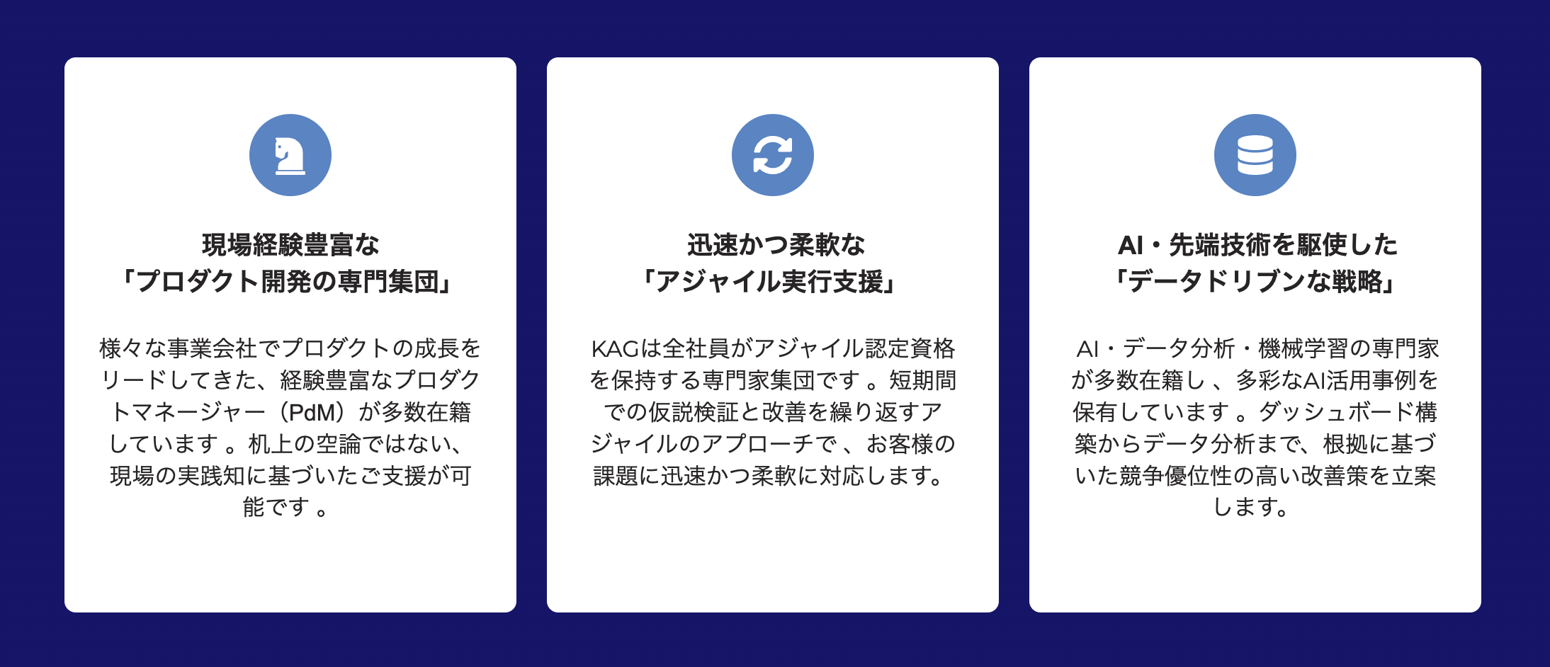 また、本プランはメガベンチャーや大手Web企業での事業責任者、PdM経験者など、実戦経験豊富なKAGのスペシャリストが担当します。 机上の空論ではない、現場の実践知に基づいたご支援が可能です 。