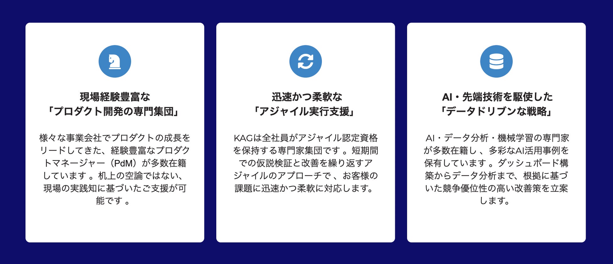 KAGは本サービスを通じて、日本企業のプロダクト開発における、データと事実に基づいたアジャイルな意思決定へ貢献してまいります。