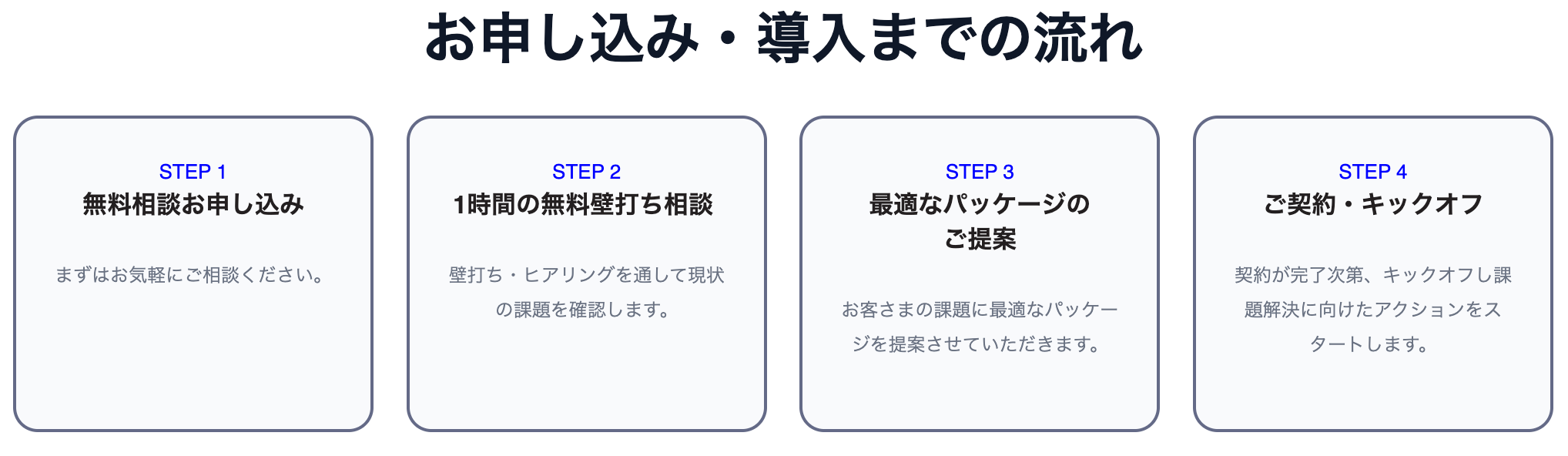 最初の1時間は無料でご相談を承ります。プロダクトの課題があればお話をお伺いし、最適なプランやパッケージの活用を検討させていただきます。まずはお気軽にお申し込みください。