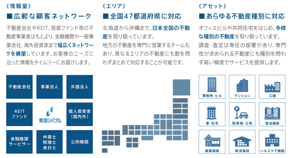 この長年の経験で培った専門ノウハウや豊富なデータに基づき、日本全国・あらゆる種別の不動産取引を支援しております。