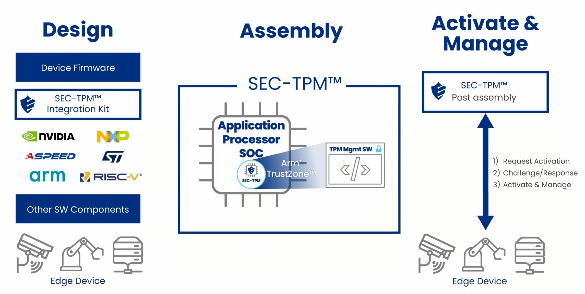 SecEdge 社の SEC-TPM は、Trusted Computing Group(TCG)が策定する TPM 2.0 に準拠したfTPMソリューションです。設計からアクティベーション・管理までをカバーする先進的なプロビジョニングサービスを含んでいるため、自社で複雑な実装や検証を行う必要がなくなり、開発負担を大幅に軽減することができます。 また、Arm®TrustZone®などのセキュアなハードウェア上で動作するため、高い性能・信頼性と省スペースな構成を実現します。SEC-TPMは既に、NXP i.MX シリーズ、STMicroelectronics STM32MP シリーズ、NVIDIA Jetson Orin など主要な Armベースのプラットフォームに対応しており、幅広いエッジ機器への導入が可能です。