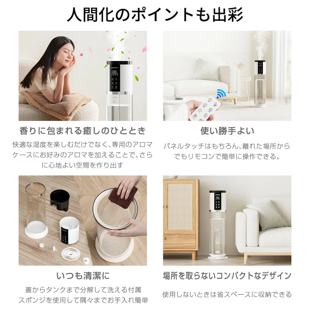 アロマ機能やリモコン操作に対応し、離れた場所からでも手軽に調整できます。タンクや内部パーツは洗いやすい構造で、日々のメンテナンスも簡単。使わないときはすっきり収まる設計など、日常に取り入れやすい利便性を追求しました。