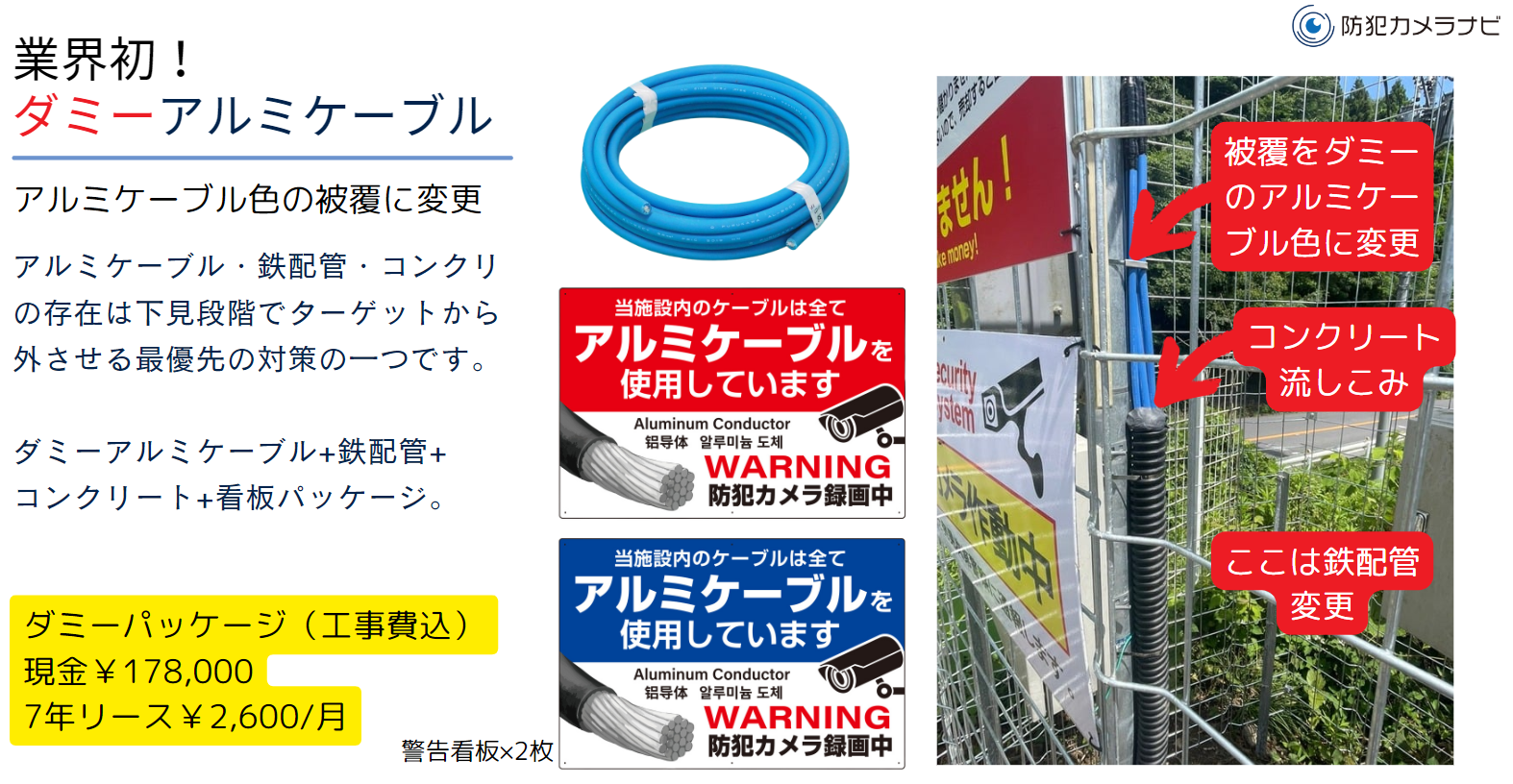 太陽光発電所の露出部分にあるケーブルを、アルミケーブル特有の青色に被覆変更します。これにより、泥棒は高価な銅線ではなく、安価なアルミケーブルだと誤認し、ターゲットから外すことが期待されます。