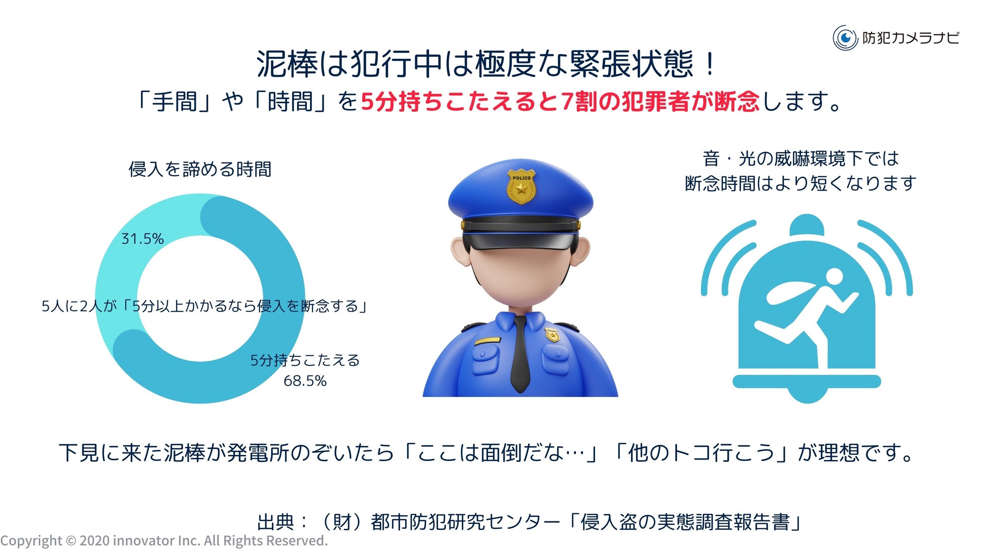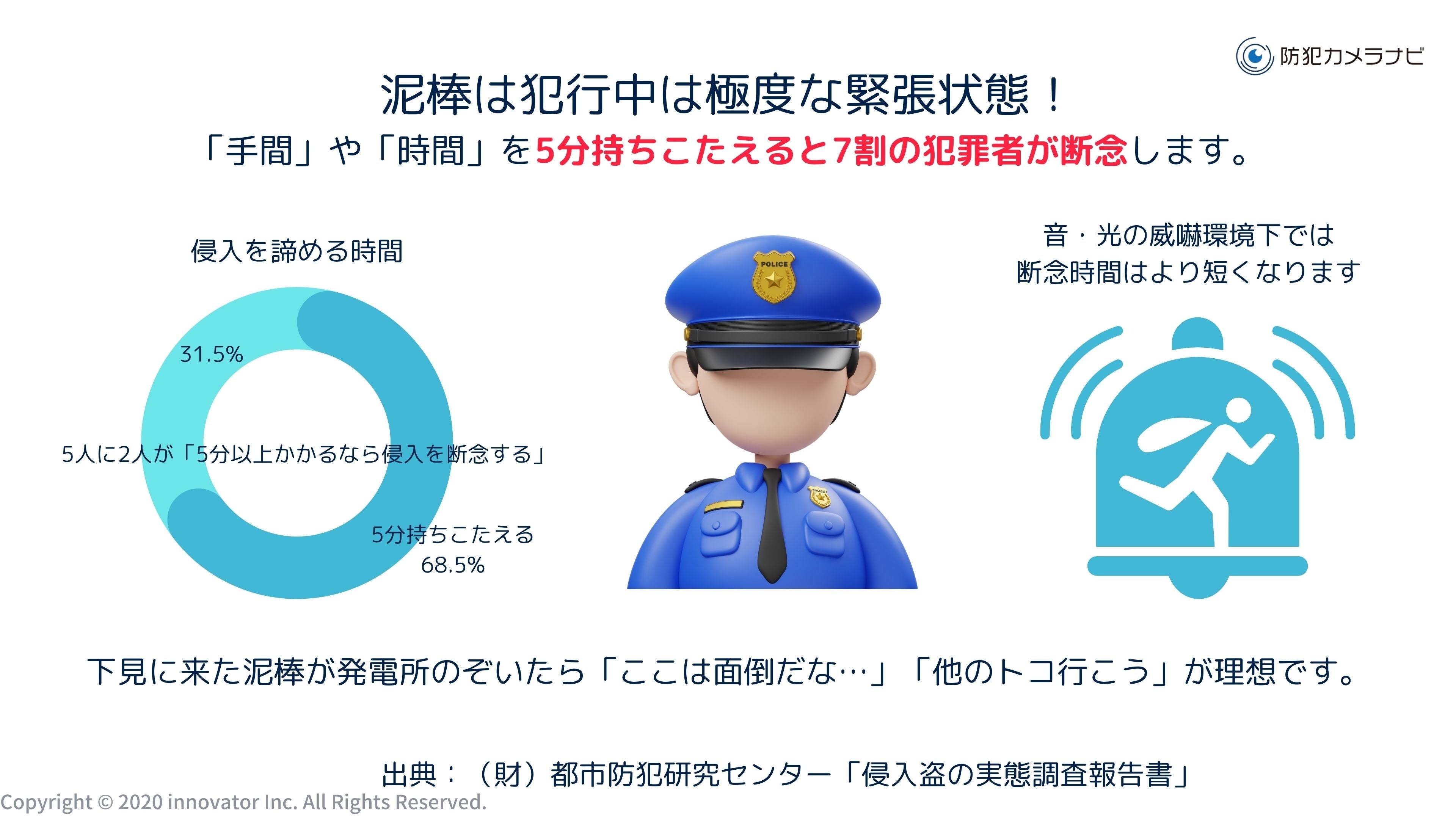 実際に、犯行途中で5分以上の抵抗を受けると、7割の泥棒が犯行を断念するというデータがあります。