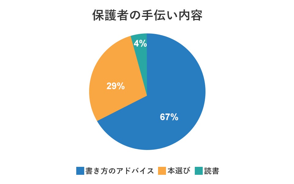 調査結果によると、最も多くの保護者がサポートしているのは「書き方のアドバイス」で、全体の約67%を占めています。これは、感想文の書き方や表現方法について保護者からの具体的なアドバイスが重要であることを示唆しています。