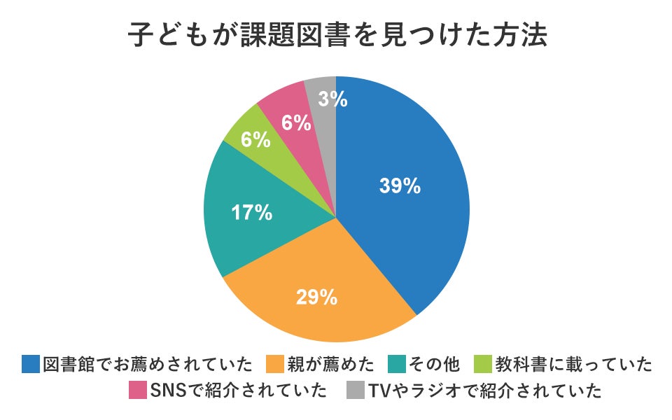 調査結果によると、最も多いのは「図書館でおすすめされていた」という理由で、全体の約39%を占めています。次に多いのが「親がすすめた」というもので、約29%です。この結果から、多くの子どもが図書館や保護者の推薦を通じて独世感想文用の本を見つけていることが分かります。