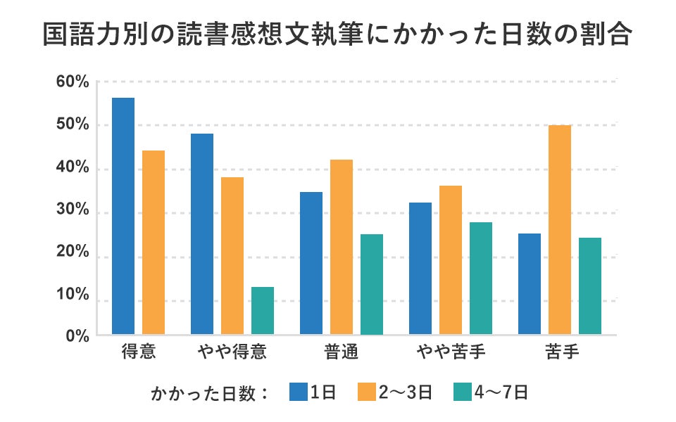 アンケートの結果から、国語力が読書感想文の執筆にかかった日数に影響していることが分かりました。国語が得意な生徒ほど、1日で書き上げている割合が多いという結果が出ています。