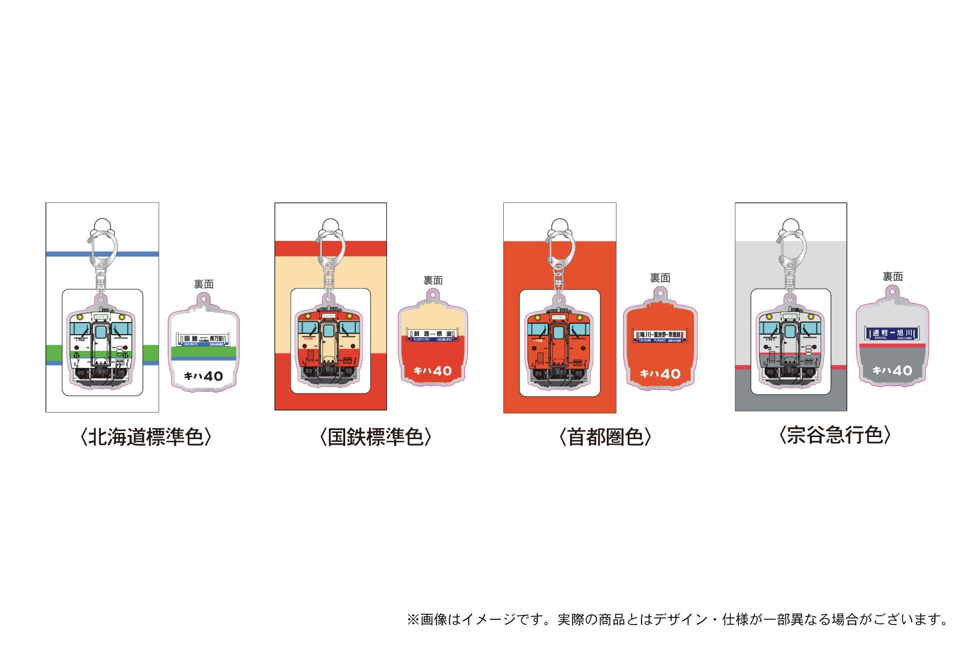 人気車両「キハ40系」の車両のメタルキーホルダーです。北海道標準色、国鉄標準色、首都圏色、宗谷急行色の4種類。