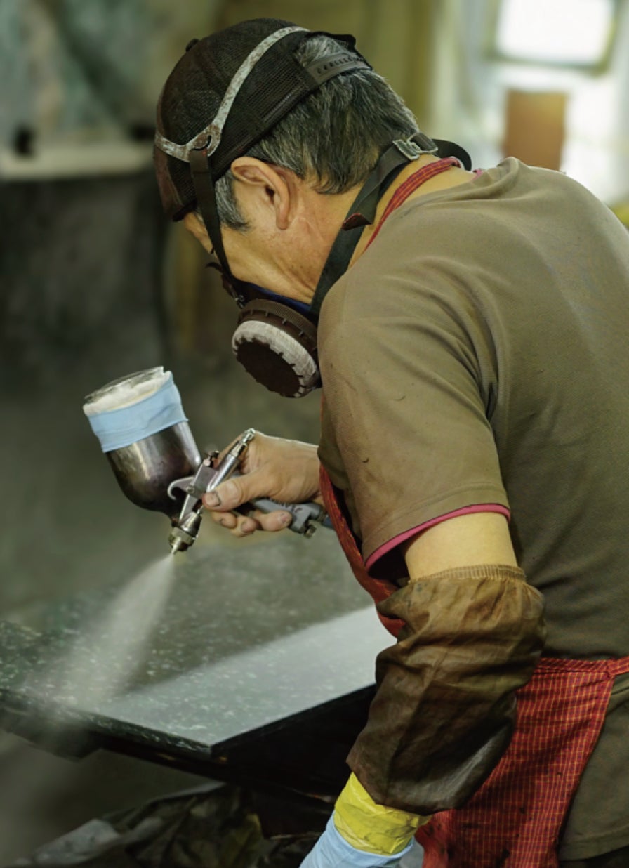 竹正の技術で施された塗装は、艶消し仕上げやツヤのある仕上げなど多様な表現が可能です。艶消し塗装では、素材本来の質感を引き立たせるマットな表現が人気で、現代的なインテリアデザインにも対応。一方、光沢仕上げでは、大理石のような高級感を演出し、様々な用途に応じた柔軟なデザイン選択を可能にしています。