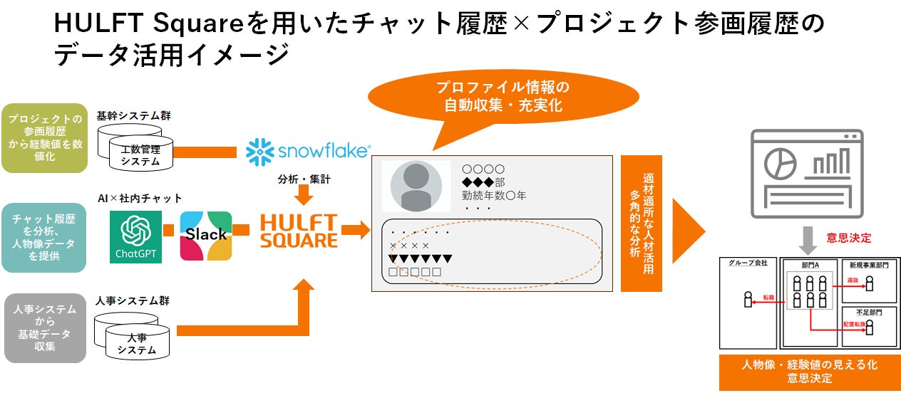 人事システムのデータだけでは見えにくい社員の人柄や興味・関心情報を、Slackのチャット履歴からChatGPTが分析し、社員の性格や人柄がデータ化されて見えるようになります。また別の活用方法として、特定のプロジェクトにおける経験を示すプロジェクトへの参画時間を集計し、業務の特性に合わせた最適な人員配置ができるようになります。
