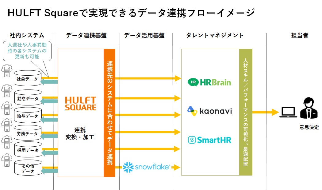 人材に纏わるデータは、例えば人事異動や入退社、人事制度変更など様々なタイミングで変更が発生し、またスキル、経験値などの幅広いデータが企業内システムに点在しています。タイムリーに且つ精度の高いデータをタレントマネジメントシステムに集約することが必要となる為、柔軟なデータ連携基盤が必要となります。このデータ連携プラットフォームとして、HULFT Squareとタレントマネジメントシステムを連携するアプリケーションテンプレートを提供し、システム連携を容易にすることで、お客さまの業務の内製化を促進します。