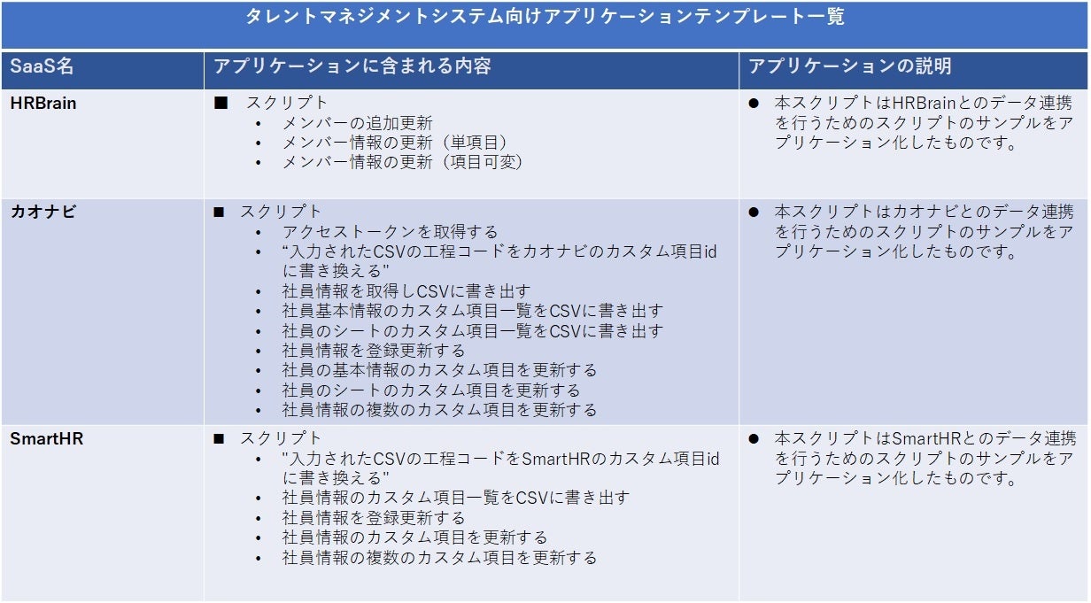 12月13日より提供されるアプリケーション テンプレートは、株式会社HRBrainの「HRBrain」、株式会社カオナビの「カオナビ」、株式会社SmartHR「SmartHR」、向けです。