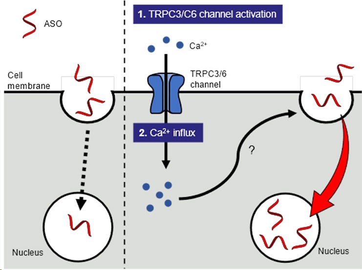 概念図. TRPC3/C6チャネルの活性化によるASOの細胞内取り込み増強