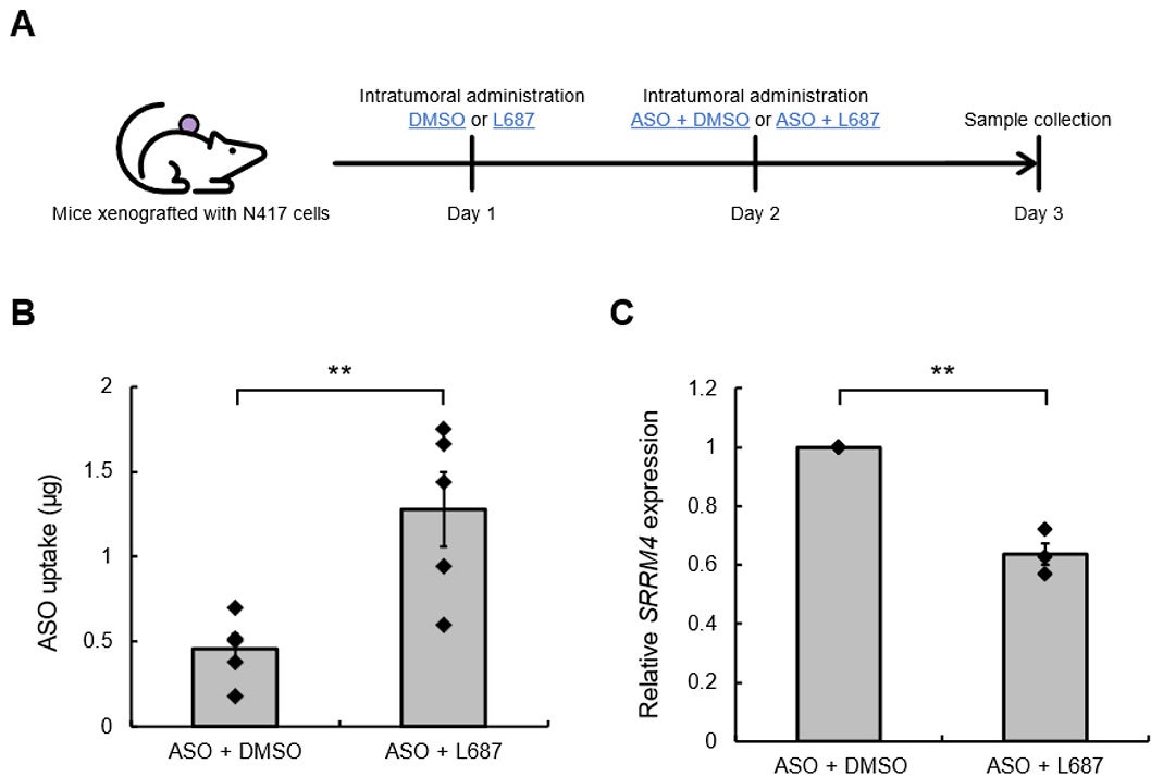 小細胞肺がん由来N417細胞を皮下移植して作成した担がんマウスに対し、SRRM4 (Serine/Arginine repetitive matrix 4) 標的ASOを用いた腫瘍内投与実験を行いました。SRRM4は小細胞肺がん及び治療抵抗性前立腺がんに異常発現しており、その発現抑制は担がんマウスにおいて抗腫瘍効果を示すことからSRRM4 標的ASOの開発が進められています (ResOU 2019-6-19●生命科学・医学系、【引用情報】 参照)。SRRM4 標的ASO投与前にあらかじめL687 (1.5 µg) を腫瘍内投与しておき、1日後にSRRM4 標的ASO (10 µg) とL687 (1.5 µg) を混合して腫瘍内投与し、さらに1日後に腫瘍を摘出しました。腫瘍細胞へのASOの移行量は、ASO配列特異的定量法ELOSA (enzyme-linked oligosorbent assay) にて解析し、並びにSRRM4遺伝子の発現抑制効果はRT-qPCRにて評価しました (図3A)。腫瘍内細胞に蓄積したSRRM4 標的ASO量を算出したところ、SRRM4 標的ASO + 溶媒のみの群 (0.46 µg) と比較してSRRM4 標的ASO + L687群 (1.28 µg) では、SRRM4 標的ASO移行量が2.78倍に増加しました(図3B)。その後、RNA抽出を行い、RT-qPCRによりSRRM4遺伝子の発現量を解析したところ、SRRM4 標的ASO + 溶媒のみの群に比べてSRRM4 標的ASO + L687群ではSRRM4遺伝子の発現量が約40%減少していました (図3C)。L687とASOの併用はin vivoにおいても有効であることが示唆されました。