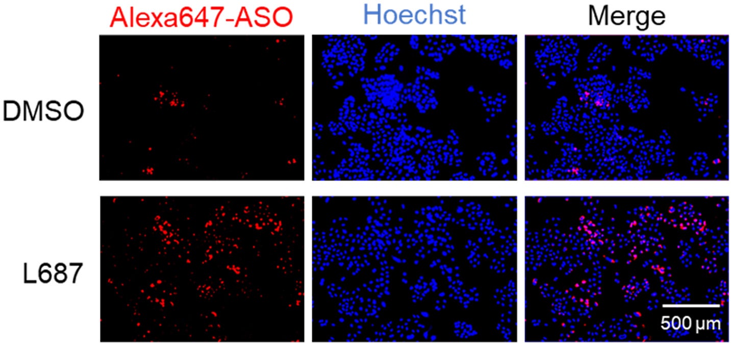 A549細胞にAlexa-647 ASO (100 nM) とL687 (30 µM) を添加し、48時間後に生細胞の核をHoechst溶液で染色し、蛍光顕微鏡を用いて撮影を行った。核は青色、ASOは赤色で表示されている。
