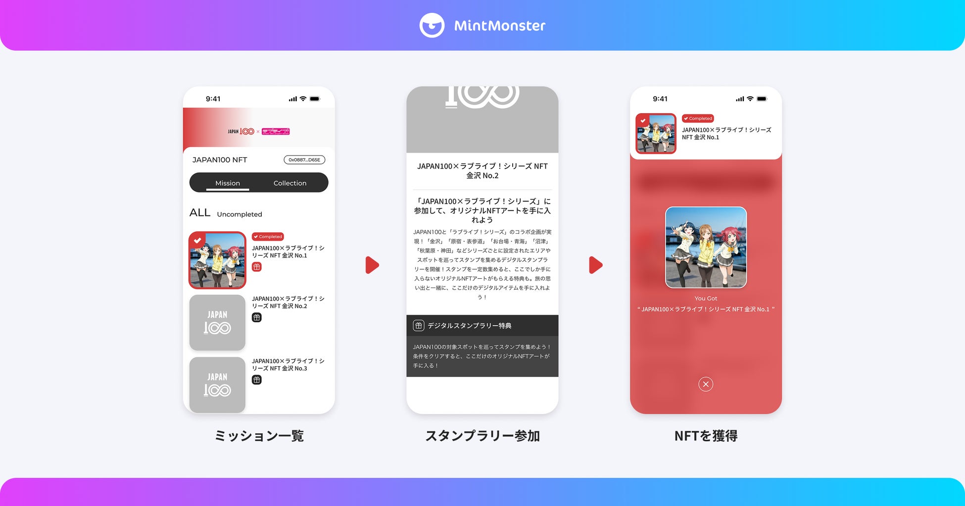 「JAPAN100」は日本全国のカルチャースポットを発見・体験するデジタルスタンプラリーです。今回、ラブライブ!シリーズとのコラボレーション企画のスタンプラリーに従来のポイント付与だけでなく、NFT獲得機能を追加することを目的に「MintMonster」を活用します。