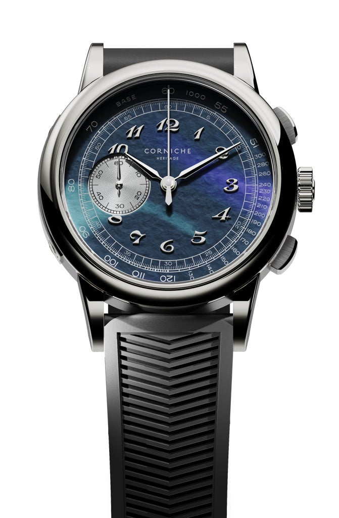 今作も、コーニッシュの人気モデル「Heritage Chronograph(ヘリテージクロノグラフ)」をベースに作製したが、今までのモデルにはなかったワンカウンタークロノグラフを特別に採用し唯一無二のデザインとなっている。通常のクロノグラフとは異なり、計測機能が1つのサブダイヤルに集約されることで、シンプルさと洗練された美しさを実現。余分な要素を排したミニマルなデザインが、視認性を高めつつクラシックな印象を与える一本となる。