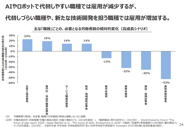 実際、経済産業省の「未来人材ビジョン」によると、「AIやロボットで代替しやすい職種では雇用が減少するが、代替しづらい職種や、新たな技術開発を担う職種では雇用が増加する」という未来予想がされています。