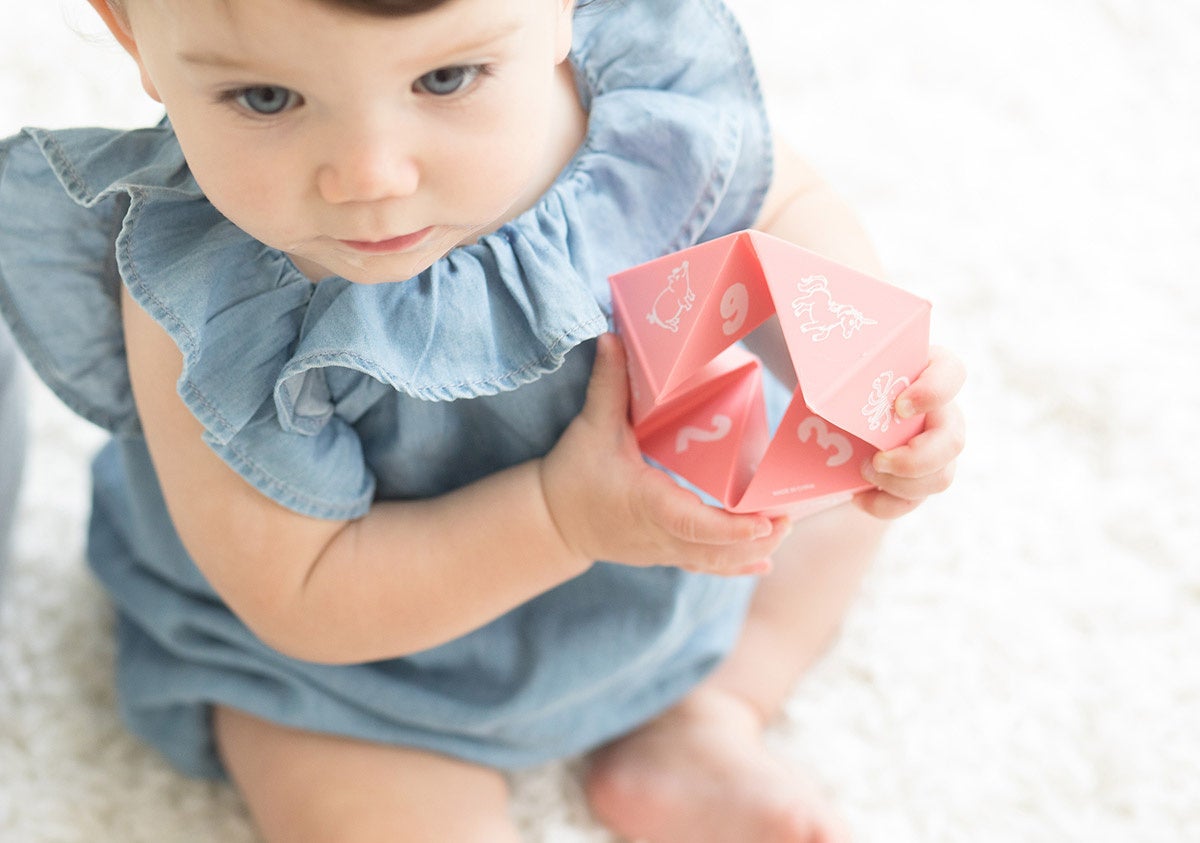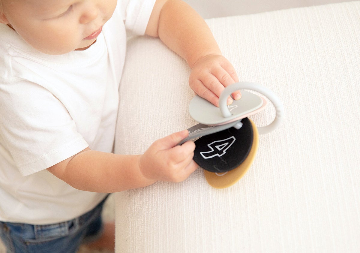 これは単なるフラッシュカードではありません。おもちゃとしてはもちろん、歯固めにもなり、学習ツールとしてもお使いいただけます。それぞれのシリコーンディスクは、単独でも安全認証された歯固めですが、セットで使えば、子供たちにカタチや動物、くだもの、数字、数え方など、遊びながらさまざまなことを教えることができます。