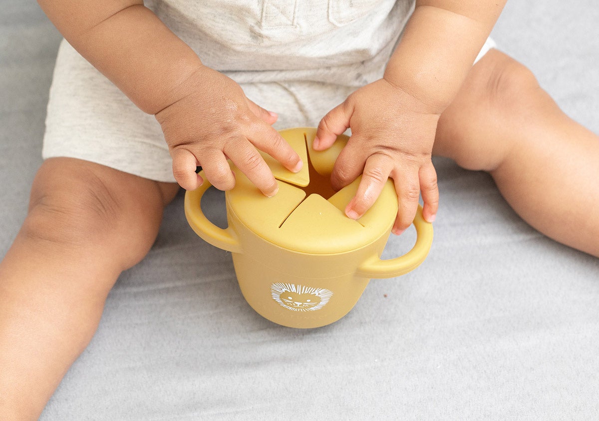 ハッピースナッカーは2つのパーツに分かれる使いやすいスナックカップです。フタの部分は固めのシリコーンでしっかりと閉めることができます。パチンと閉まる柔らかいシリコーン製の取り出し口は、小さな手を差し込んで食べ物を取り出しやすく、食べものがこぼれ出るのを防いでくれます。握りやすいハンドル設計で車のシートやベビーカーのカップホルダーにもフィットします。