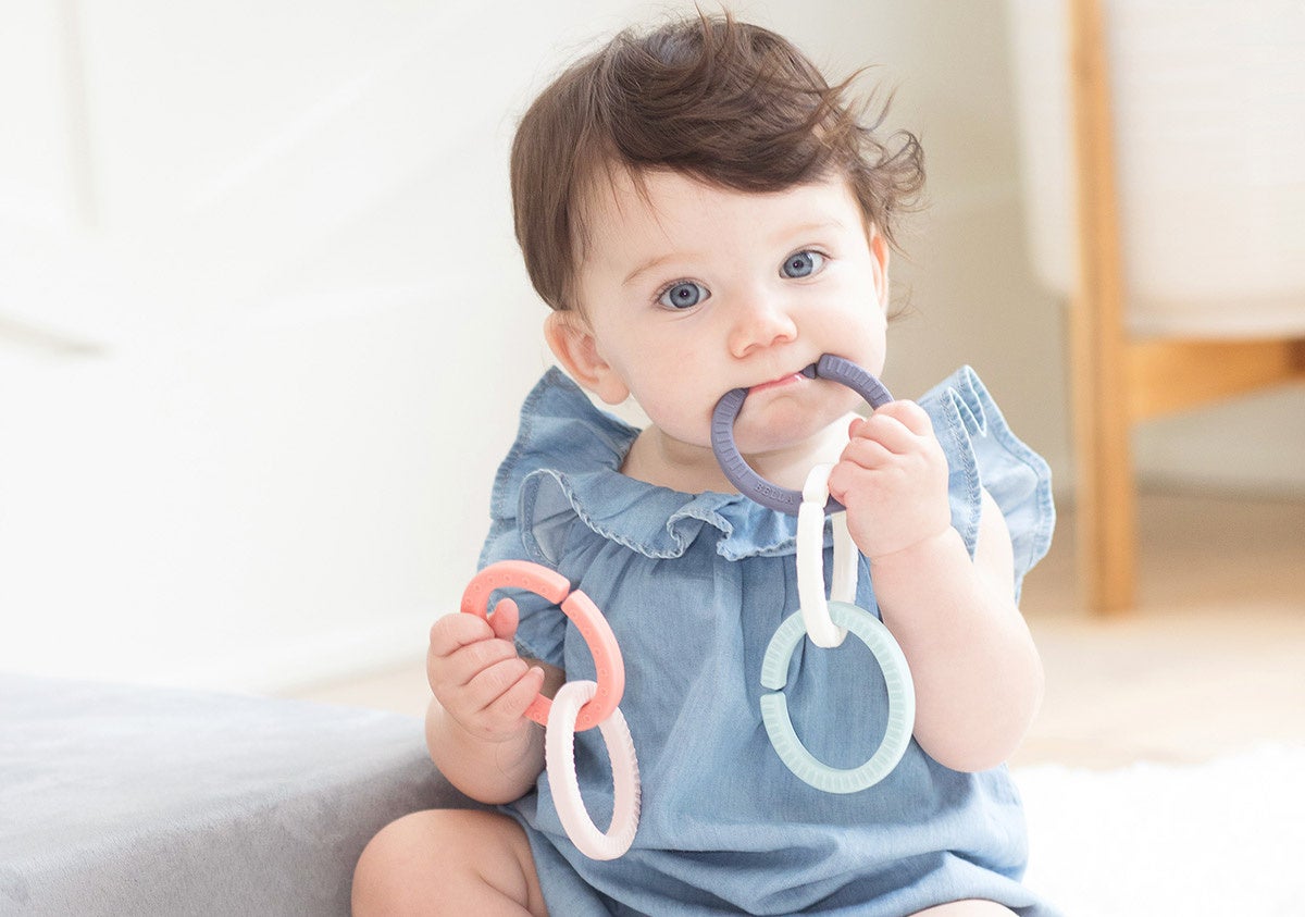 シンプルで馴染み深いリングを私たちが子供たちのために持っていたいと思う製品にしました。安全性の高い食品用シリコーン素材で握りやすい大きさのリングは小さな歯茎を和らげ、子供たちを楽しませることができます。ベビーカーやチャイルドシート、抱っこひもなどに取り付けて、どこでも楽しく遊べます。