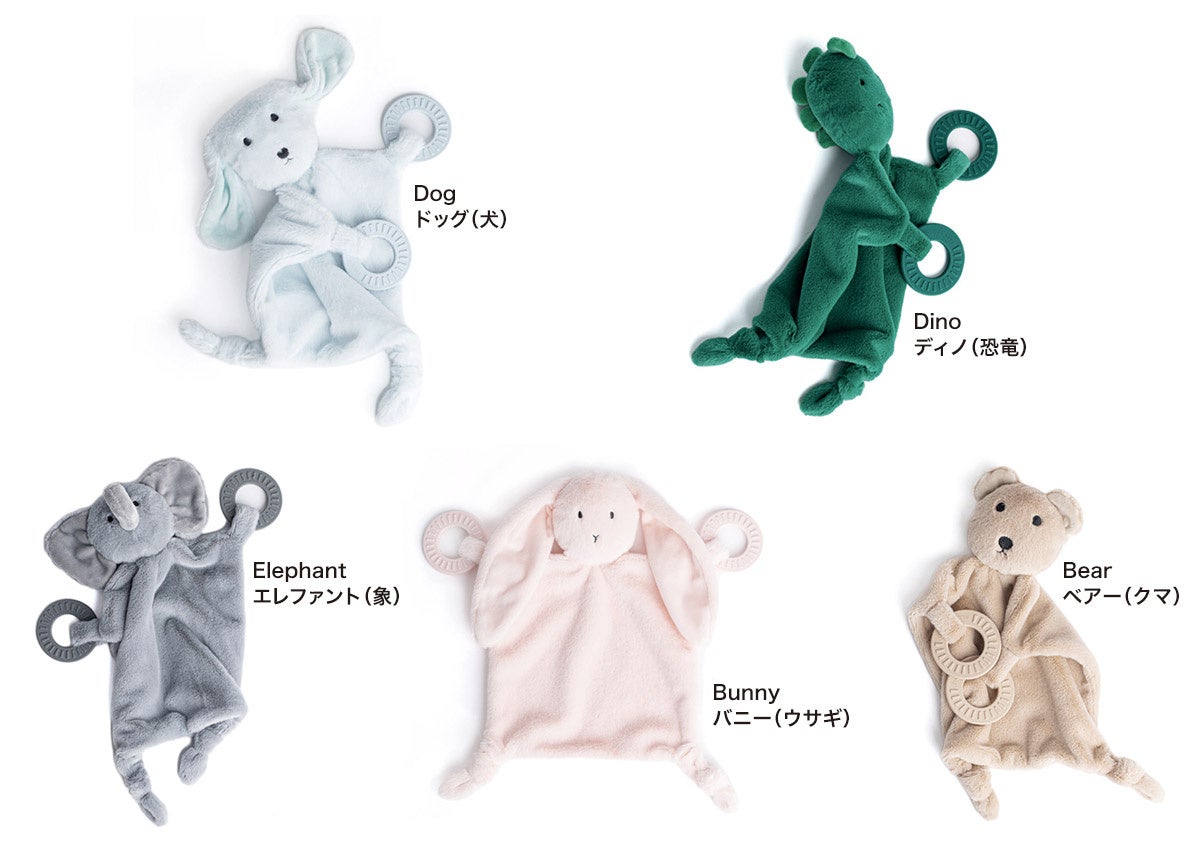 子どもたちと一緒に成長し、友達であり続けるようにデザインされた優しい色合いの動物たち。イヌ、恐竜、ゾウ、ウサギ、クマ、5種類での展開です。0歳から安心して遊べるように作られているので出産御祝としての贈り物にもぴったりです。