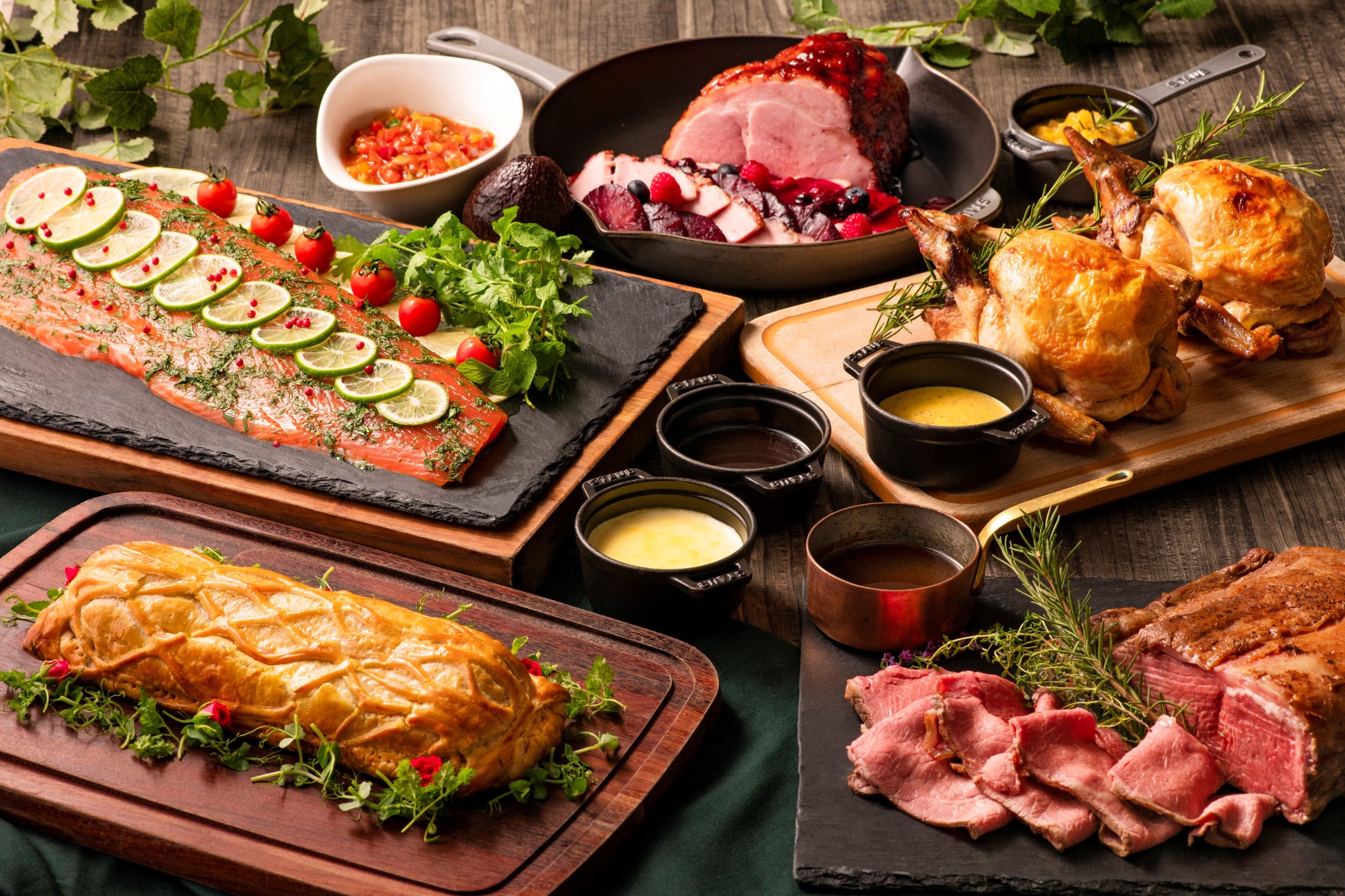 ランチには、ハーブやパプリカ、オニオンなど色鮮やかなソースで味わう「グラブラックスサーモン サンタフェソース」や、大きな塊の豚もも肉を低温でじっくりと焼き、クランベリーがごろっと入ったソースでお召し上がりいただく「ローストハムのクランベリーソース パイナップルレリッシュ添え」、ディナーには、サーモンやスピナッチ、ポルチーニリゾットなどをパイの間に巻きこみ、香ばしく焼き上げた「サーモンクリビアック ショロンソース」や、ジューシーなお肉の旨味をぎゅっと閉じ込めた「サーロインのローストビーフ グリーンペッパーソース」などの特別メニューが登場します。ペストリーシェフ特製のデザートがビュッフェテーブルを彩り、“たのしい記憶が残るお料理”をご提供いたします。