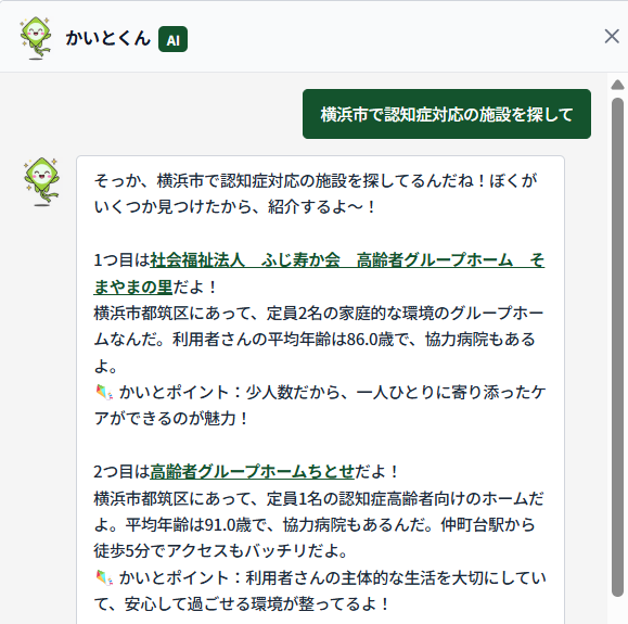 今回のリニューアルでは、EEFUL DBの中核機能として、AIを活用した介護事業所検索・相談体験を強化しました。