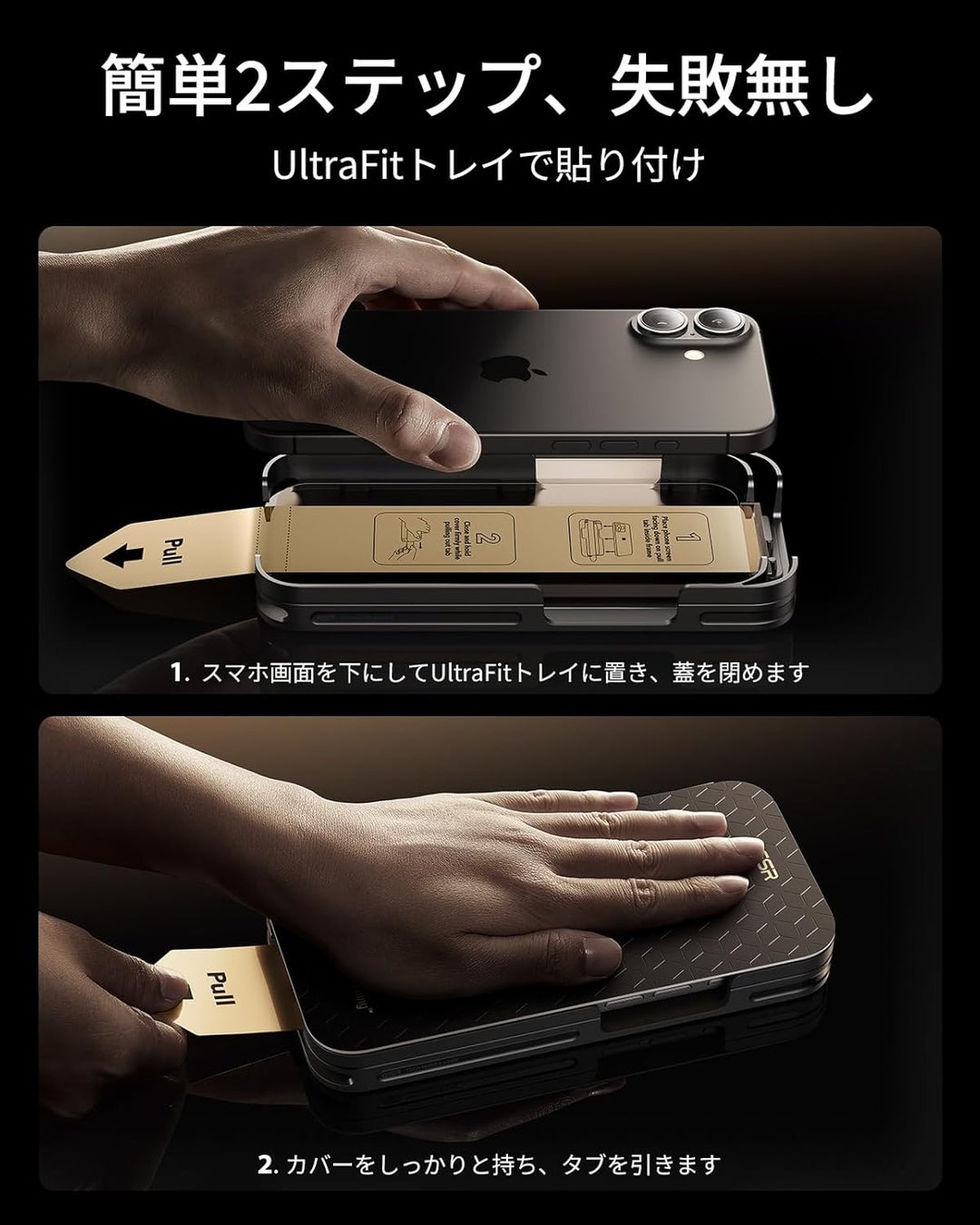 専用貼り付けツール「UltraFitトレイ」で、2ステップで、誰でも簡単に気泡・ホコリ混入がしない正確な貼り付けが行えます。