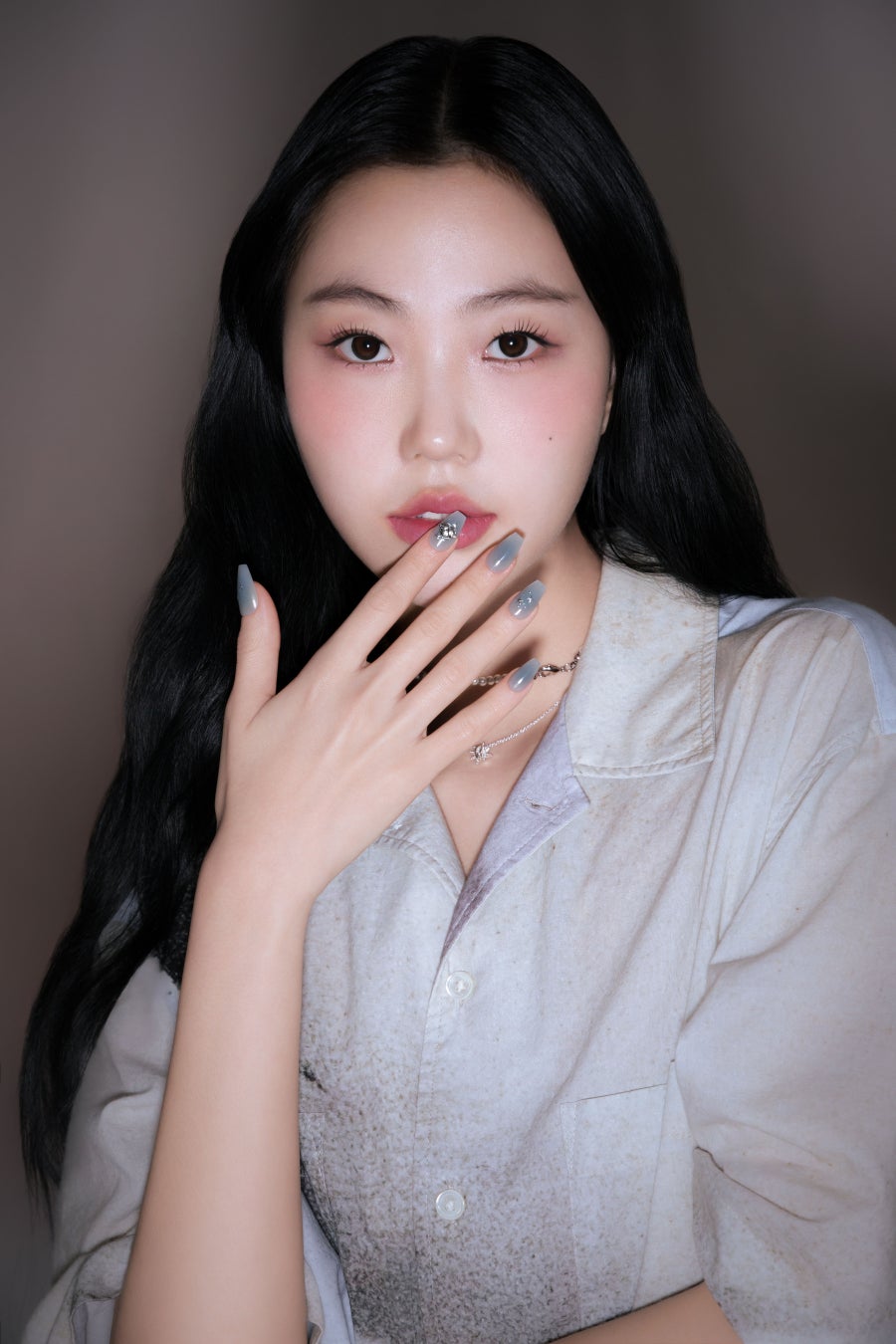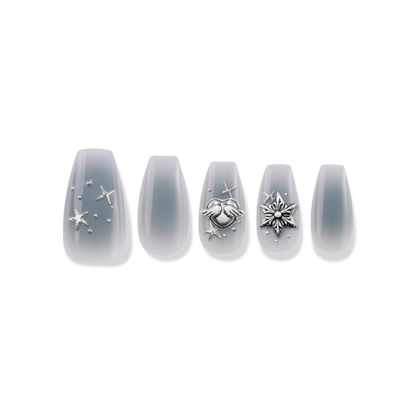 シルバーのシーリングワックス(封蝋)をハートの形に溶かしたような、FINGER SUITならではのユニークさをプラスしたシーリングドローイングネイル。ブルーカラーが一滴入ったようなストーングレーカラーとシリアルグリッターが組み合わさり、カジュアルなルックを演出するのにピッタリなデザインに仕上げました。