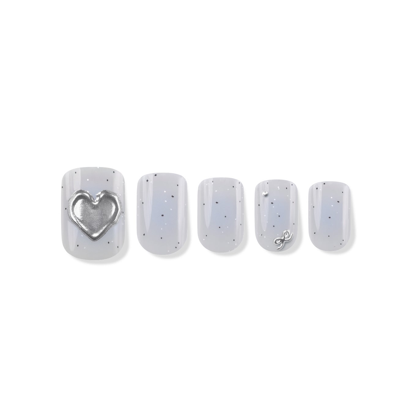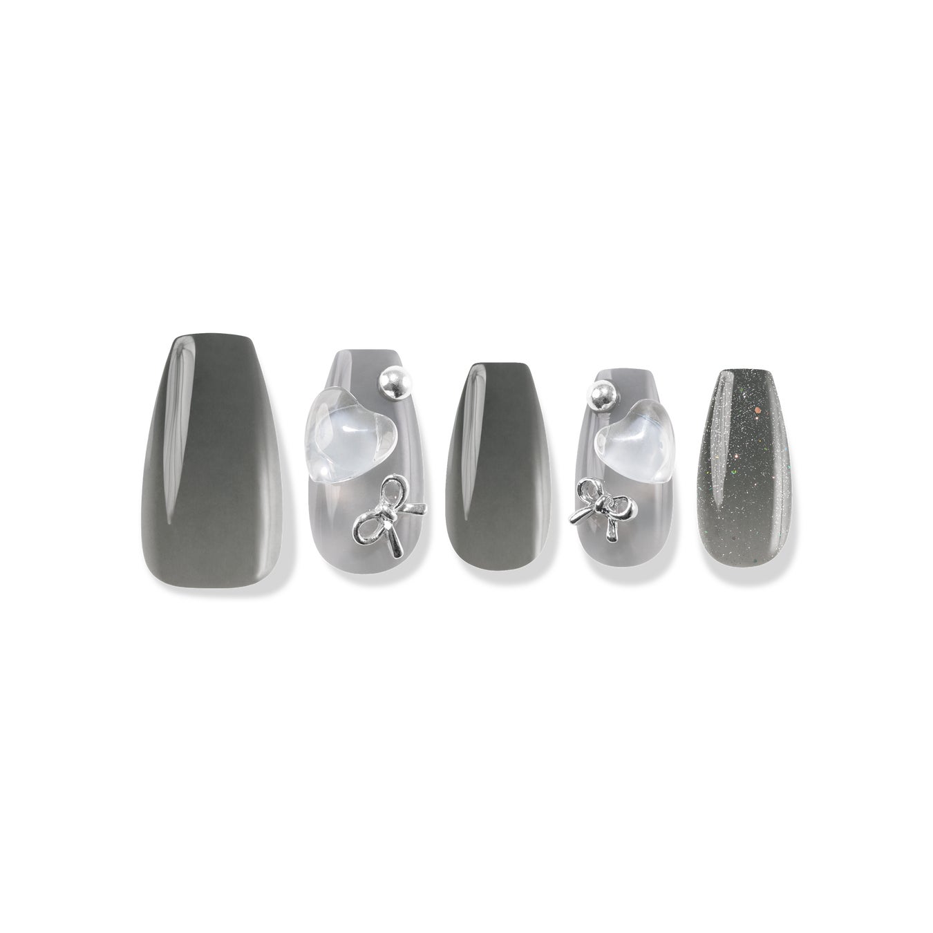FINGER SUITが新たに提案するムードのフルパーツネイル。透明ハートパーツとシルバーリボンパーツをブラックシロップの上に乗せることで、ラブリーさとシックさが合いまった魅力を発揮するデザインです。澄んだシロップとシルバーの組み合わせがクールで清楚なムードを演出する、ユニークでおすすめのブラックネイルデザインです。