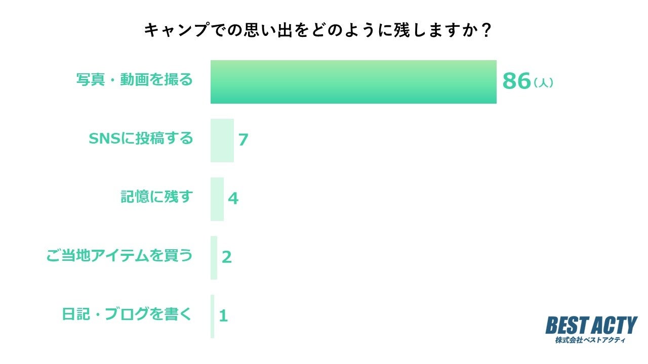 キャンプの思い出をどのように残すかについて100名にアンケートを行ったところ、「写真・動画を撮る」と回答する人が最も多い結果となりました。