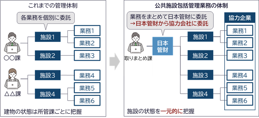 公共施設包括管理とは、地⽅公共団体が保有する公共施設の設備点検・修繕業務等を⼀括管理する管理方法です。施設の老朽化が課題となる中、建物や設備に関する保守点検や小修繕といった維持管理業務のマネジメント(契約、履行確認、支払い事務等)のほか、施設の巡回点検等を、施設管理の専門的知見を持つ民間事業者へ包括的に委託し、施設の安全性の向上や効率的な管理を目指すものです。民間の技術やノウハウを活用することで、管理品質の適正化、各業務における専門性の向上などが期待されています。