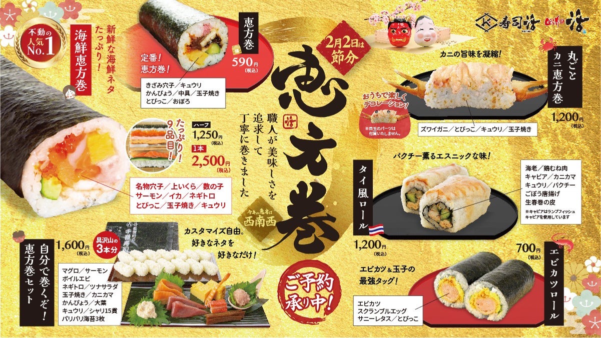 株式会社活美登利(本社:東京都品川区、代表取締役社長:土屋秀仁)が運営する「回し寿司活/寿司活」は、2月2日(日)に販売する恵方巻のご予約受付を開始いたしました。