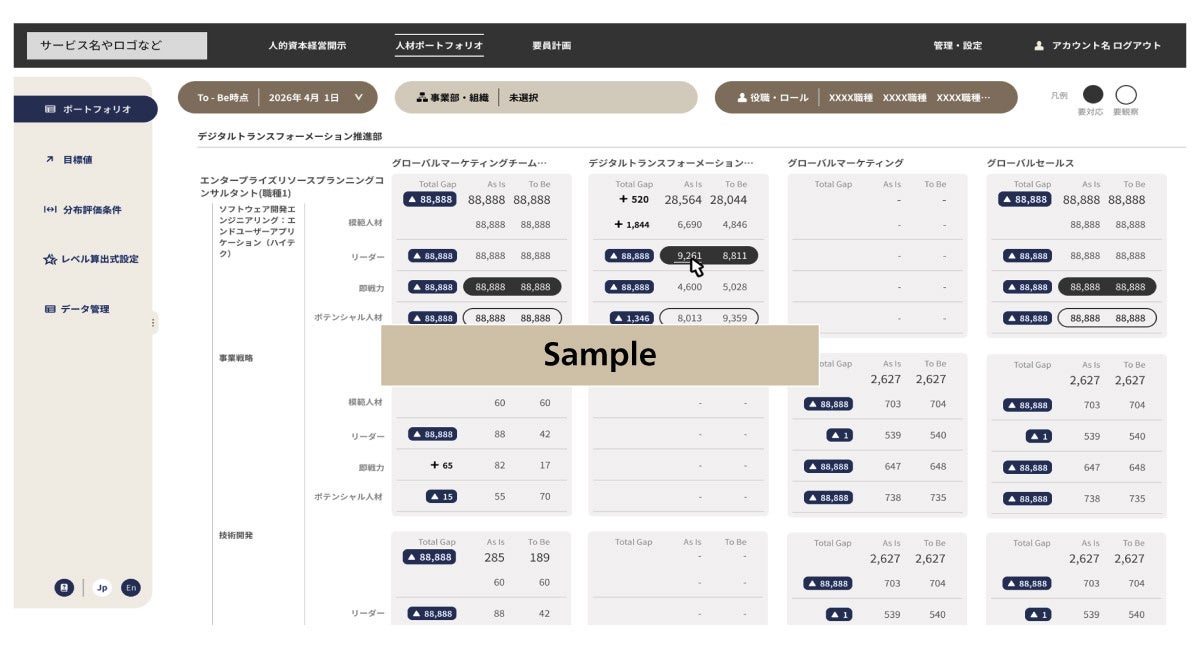 従業員のロールやスキルデータを基に、事業の重点領域における人材充足状況を可視化。人材ポートフォリオを「量」と「質」の両面で管理し、適切な人材マネジメントを可能にします。