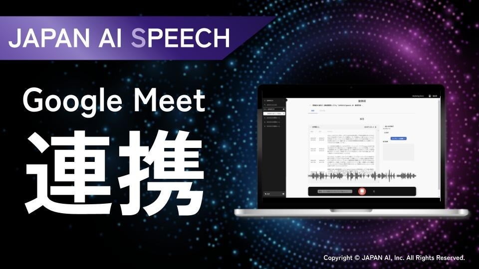 JAPAN AI株式会社(本社:東京都新宿区、代表取締役社長:工藤 智昭、以下JAPAN AI)は、AI議事録作成システム「JAPAN AI SPEECH(™)」をGoogle Meetと連携させることで、Google Meetでのオンライン会議終了後に自動的に議事録を作成できる機能を追加したことをお知らせします。