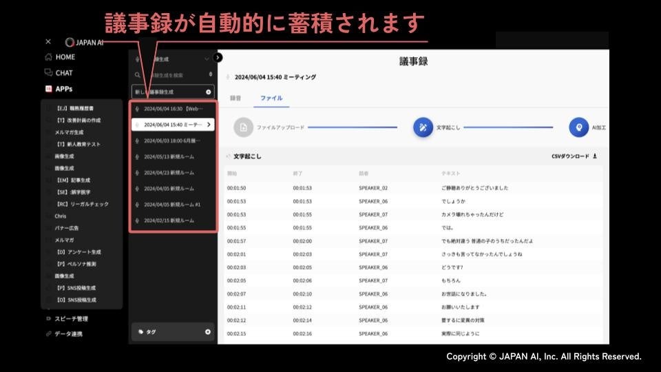 文字起こしは、話者分離された状態で行われ、「JAPAN AI SPEECH(™)」 に保存されます。