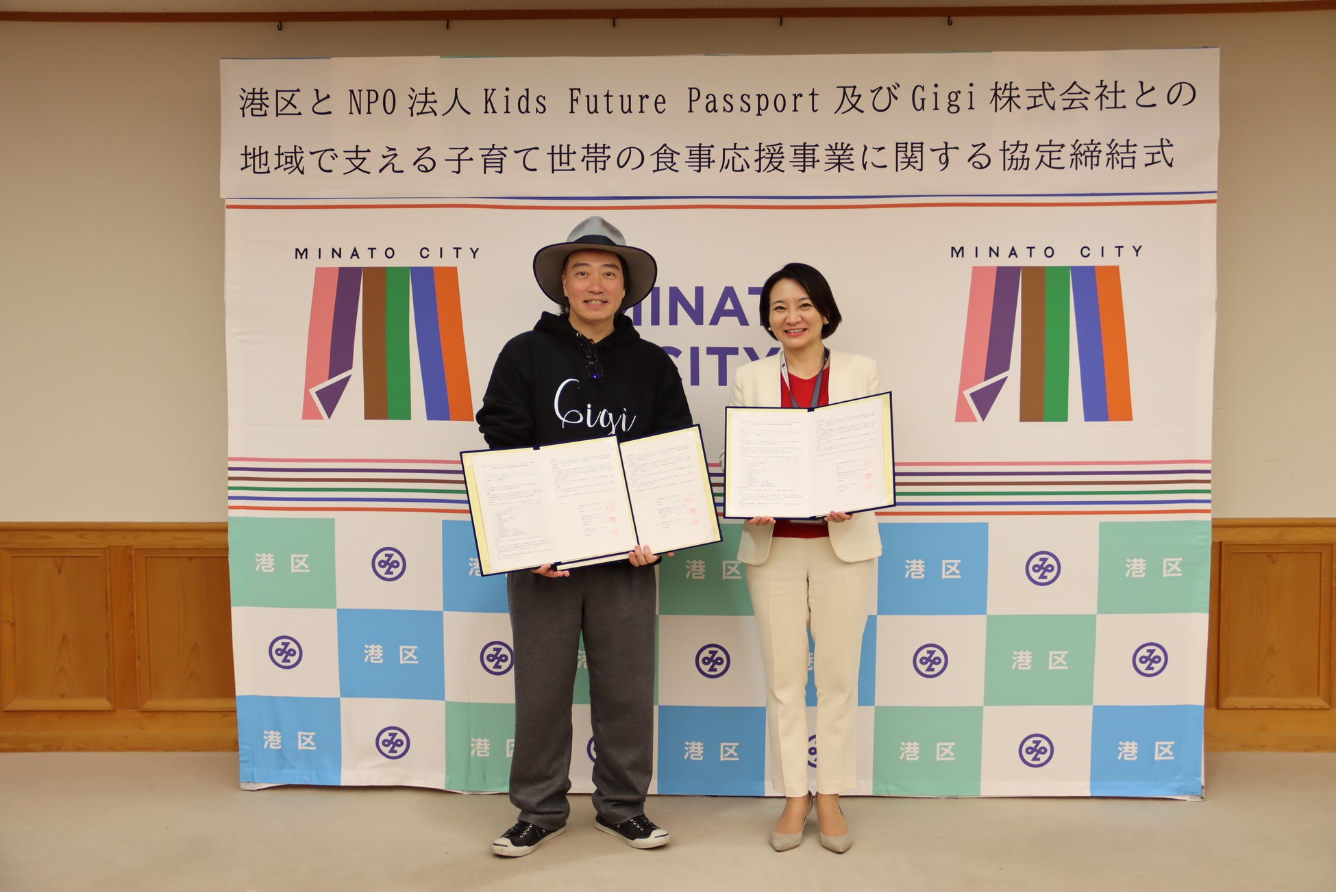 NPO法人Kids Future Passport(読み:キッズ・フューチャー・パスポート、所在地:福岡県福岡市、代表理事 今井了介)、Gigi株式会社(本社:東京都港区、代表取締役:今井了介)、港区の3者はこの度12月24日(火)に実施いたしました、協定締結式にて「地域で支える子育て世帯の食事応援事業に関する協定」を締結いたしました。