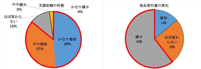 一方で、フードバンク団体による食料支援は、地域のすべてのニーズを十分にカバーできていないのが現状です。弊会の加盟フードバンク団体を対象に昨年実施したアンケート調査では、8割以上の団体で困窮世帯からの食料支援要請が増加している一方で、6割のフードバンク団体では食品の寄付が減少していることが明らかになりました(図1)。