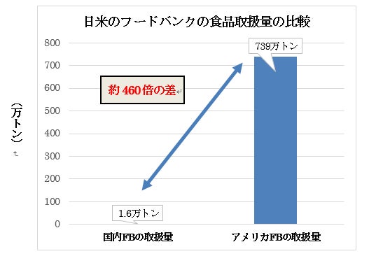 一方、アメリカのフードバンクの年間食品取扱量は739万トンで、これは国内の食品ロス発生量(472万トン)より多く、国内フードバンクの取扱量である1.6万トンの約460倍に相当します(図2)。このようにアメリカでは、膨大な量の食品ロス削減と、経済的な困難を抱える世帯への食料供給に、フードバンクが大きく貢献しています。