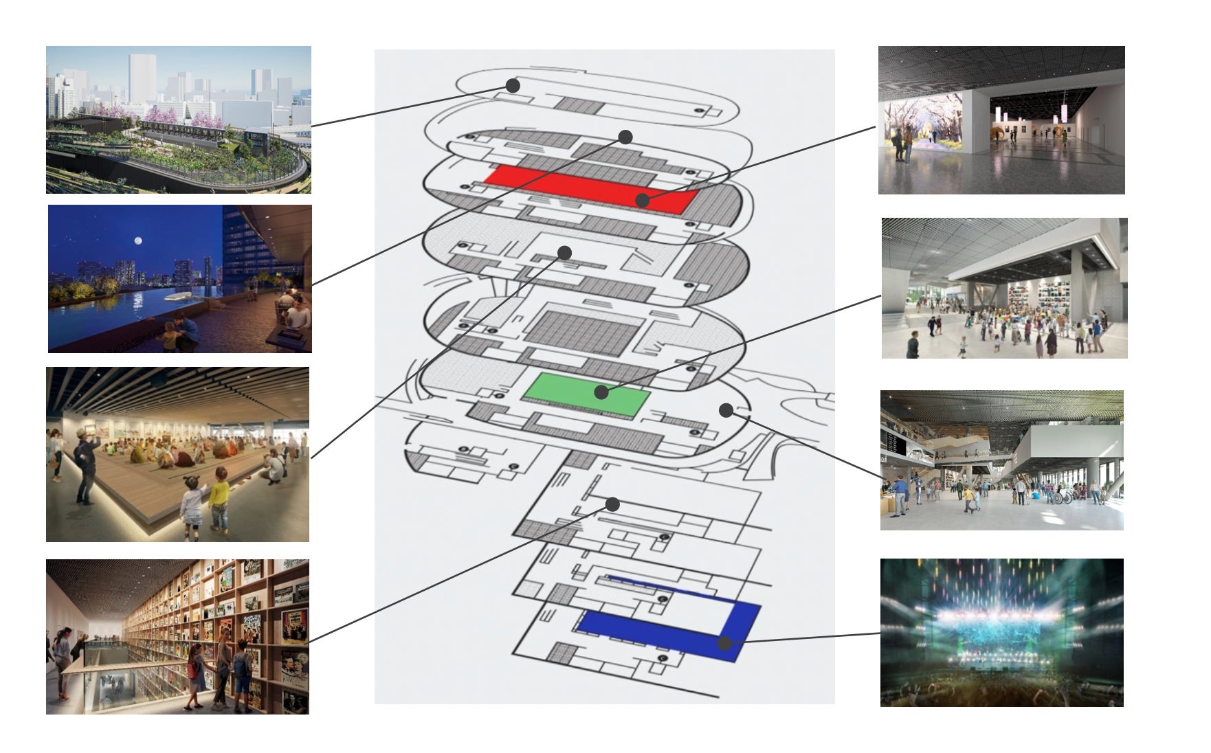 地下3階〜地上6階まで複数の展示・体験空間を展開