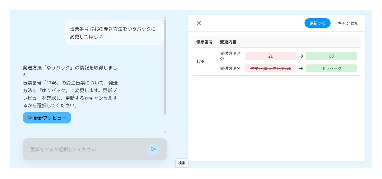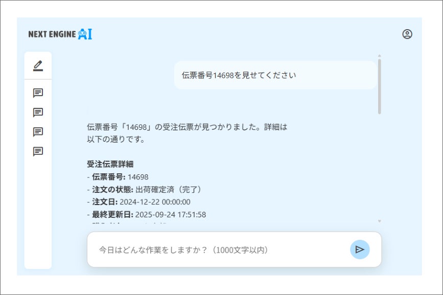 ユーザーは「受注を検索して」「この伝票を更新して」など、自然言語で指示するだけで、AIがネクストエンジン上の操作を自動で代行します。