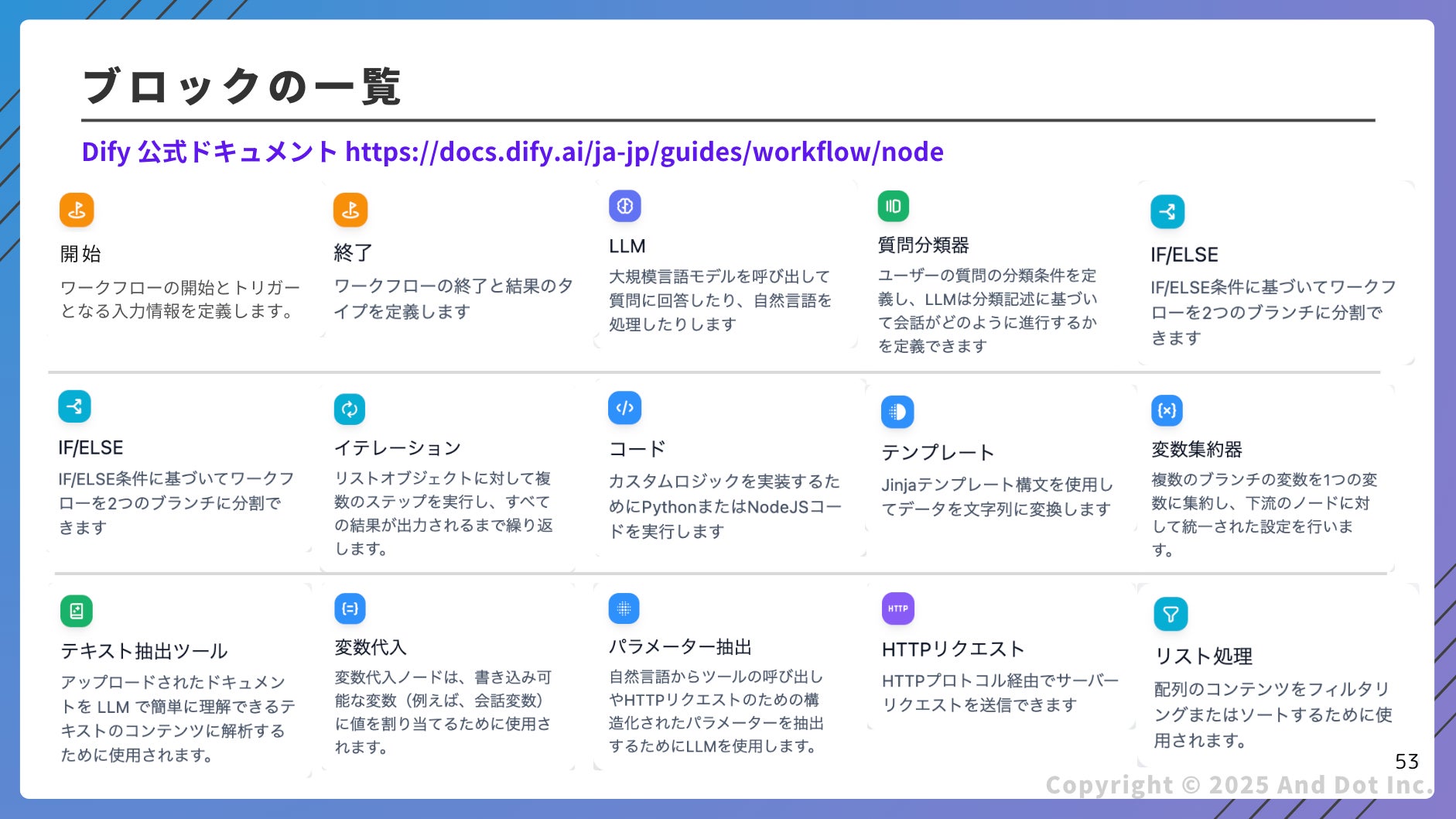 上記のコンセプトを土台に、本研修ではDify操作の基礎から外部API連携といった実践的なハンズオンを行いました。研修後も引き続きDifyを活用した実利あるアプリケーションの構築をお薦めしています。
