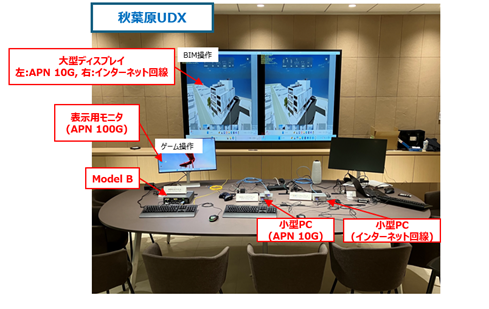 本検証では、NTTドコモソリューションズの都内データセンターと NTTアーバンソリューションズの秋葉原UDX(千代田区)にある「未来のオフィス 4×SCENE®※3」、ならびにNTTファシリティーズの田町グランパーク(以下 田町GP、港区)にある共創空間「FL@T®※4」をIOWN® APNで接続しました。データセンター側には高度なICT機器としてGPUマシンを設置し、建設・設計業務で利用するBIM環境などを構築しました。オフィス側には以下の通り3つの構成を構築しました。