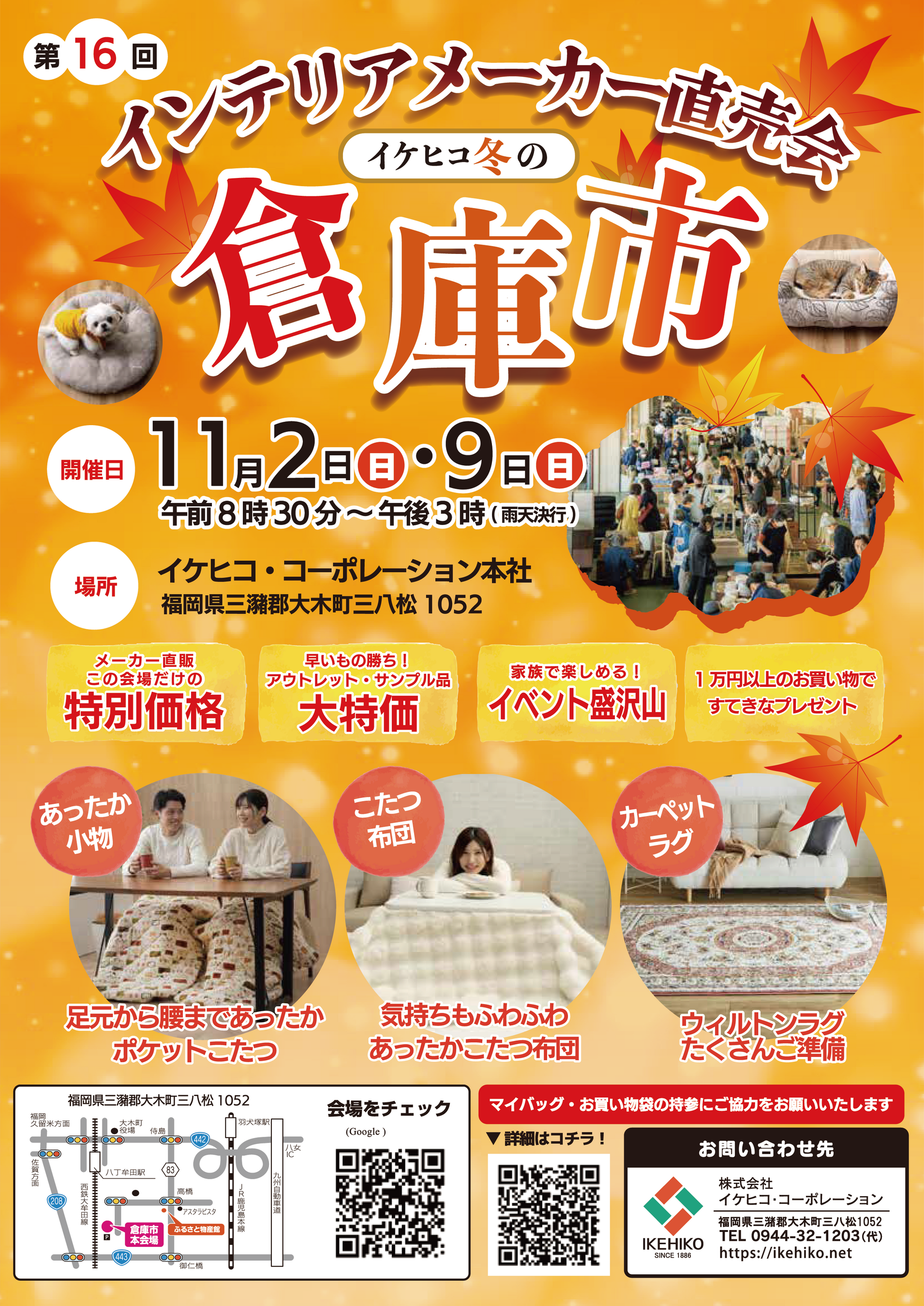 2025年11月2日(日)・9日(日)の2日間、冬の暮らしを快適にする人気商品を集めた恒例イベント「第16回 イケヒコ冬の倉庫市」を開催いたします。福岡県大木町の美しい自然に囲まれた本社を持つインテリアメーカー、株式会社イケヒコ・コーポレーション(代表取締役社長:猪口 耕成)が主催するこのイベントは、地域のみなさまへの感謝を込めて、社員が自らが企画・運営するものです。