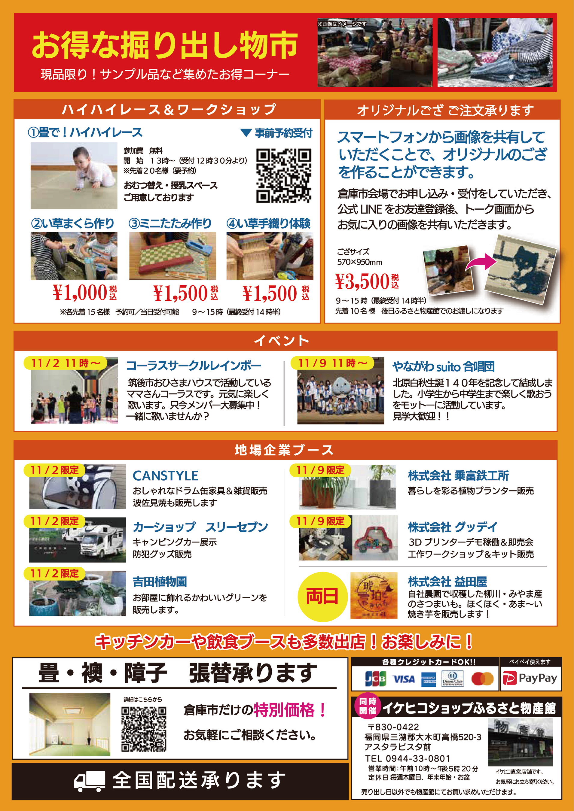 さらに、「オリジナルござ作り」や「畳でハイハイレース」といった体験コーナーや、地域企業の出店、合唱団のステージなど、地元とともに楽しめる温かな雰囲気をごゆっくりお楽しみいただけます。