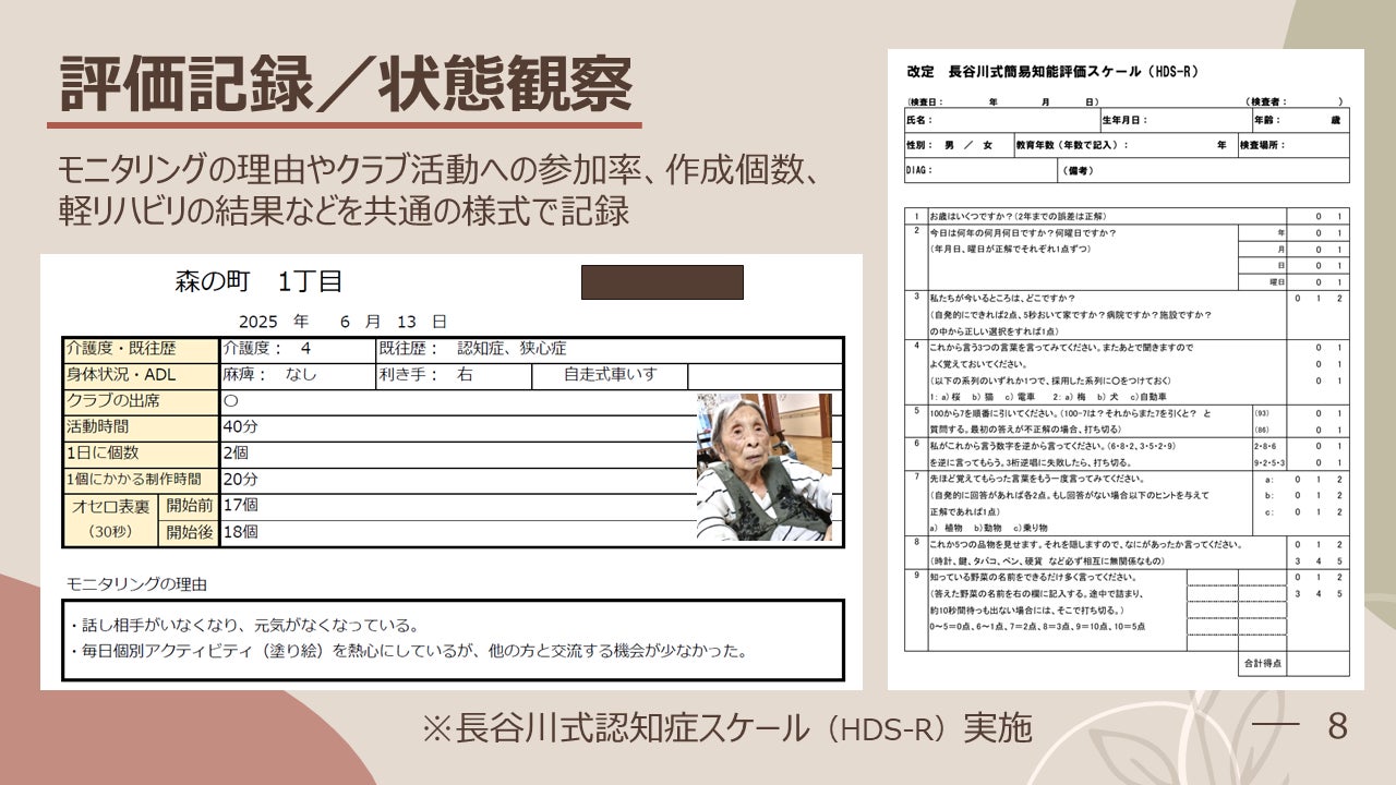 表情、集中力、会話量、意欲など、日常の変化を細かく記録。